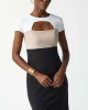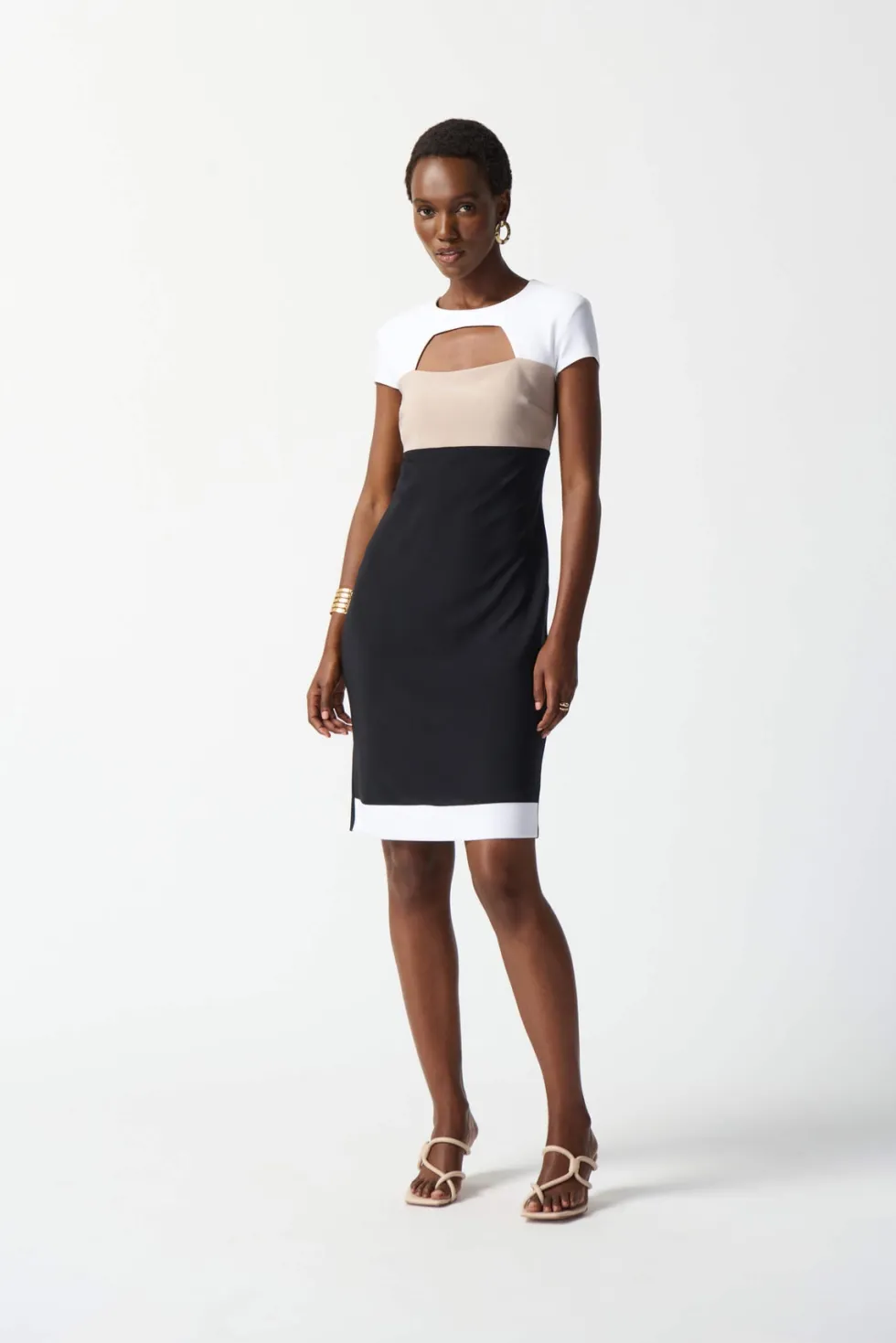 This is a sale item and is only eligible to return for a store credit or exchange. Casablanca Colour Block Sheath Dress 242156 Discover this solid fused silky knit color-block sheath dress that exudes playful elegance. A cutout at the front and back chest adds a touch of flair, while cap sleeves and a crew neckline en