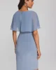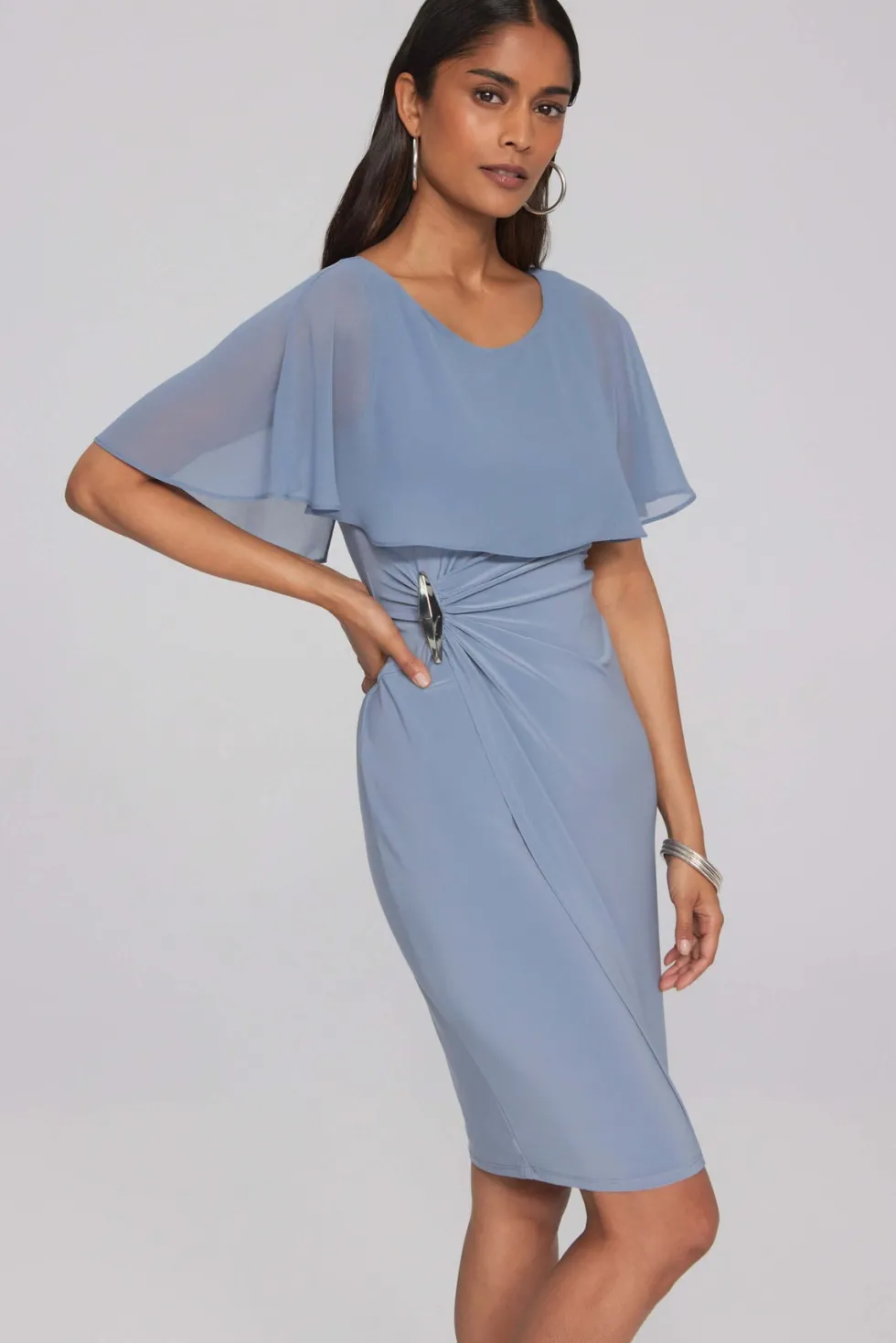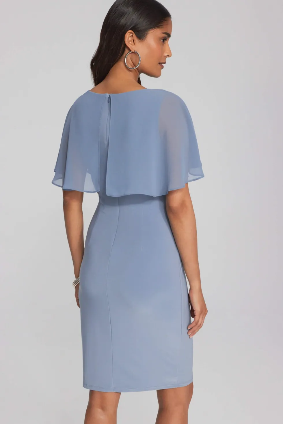 Chiffon Cape Signature Sheath Dress 241708 by Joseph Ribkoff at The Wardrobe This is a sale item and is only eligible to return for a store credit or exchange. Available on request in Midnight Blue & Majesty7 Mauve. Step into elegance with this silky knit sheath wrap dress. Its stunning chiffon cape attached at th