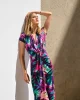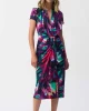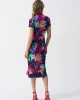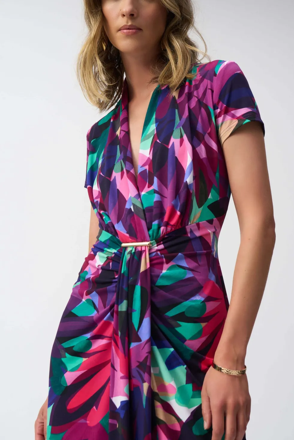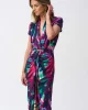 Paradise Cove Tropical Print Wrap 251042 by Joseph Ribkoff at The Wardrobe. Indulge in the utmost glamour while wearing this silky knit dress. Exquisitely adorned with a vibrant tropical print, the garment was tailored to be a unique standout. The wrap neckline and short cap sleeves infuse charm into the design while t