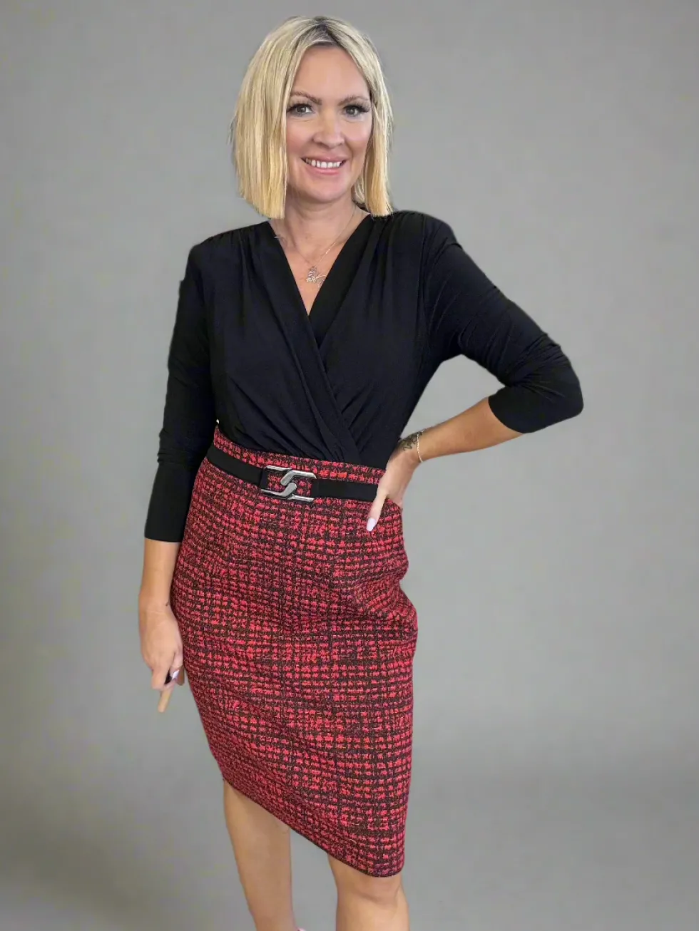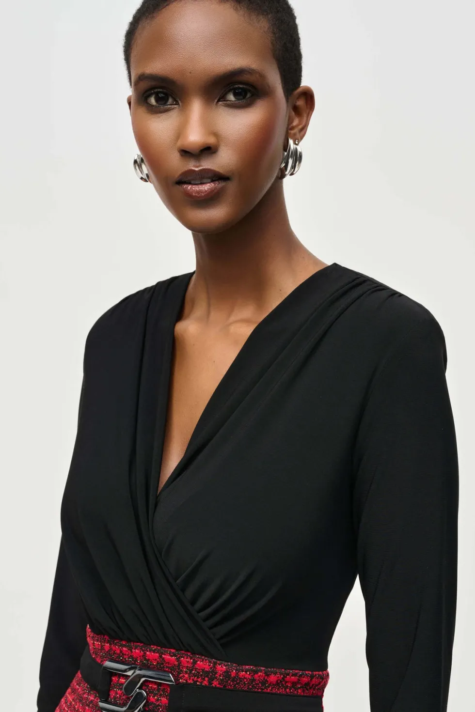 Queen of Scots Jacquard Kit Plaid Sheath Dress 243060 by Joseph Ribkoff at The Wardrobe. This is a sale item and is only eligible to return for a store credit or exchange. Add a hint of vintage glamour to your personal style with this charming sheath dress. The silky knit wrap neckline paired with the plaid print on t