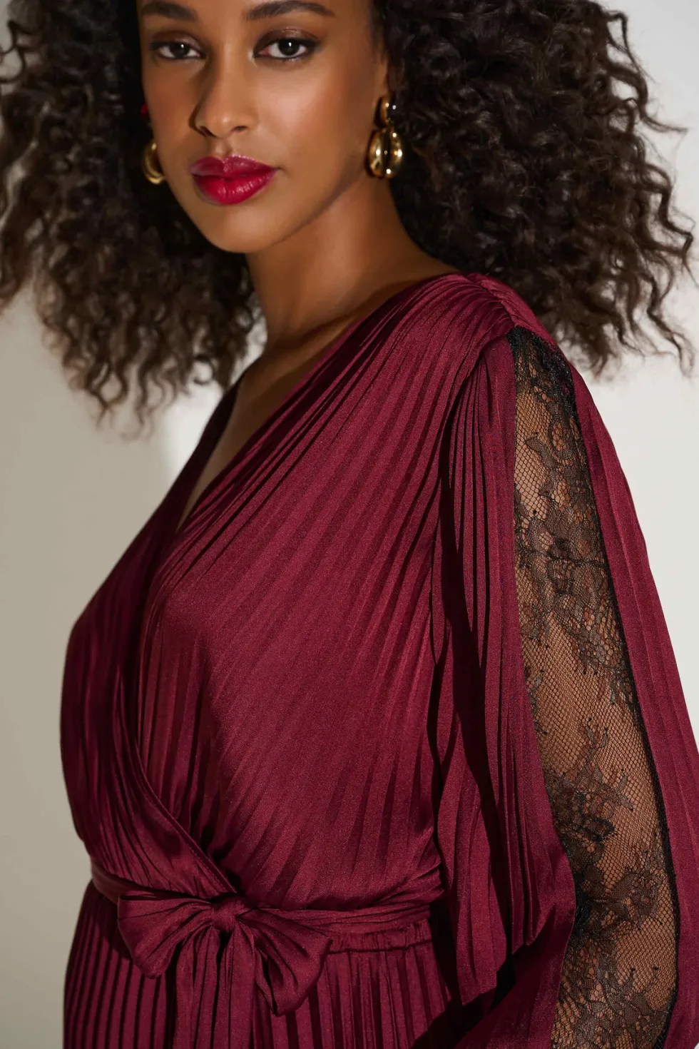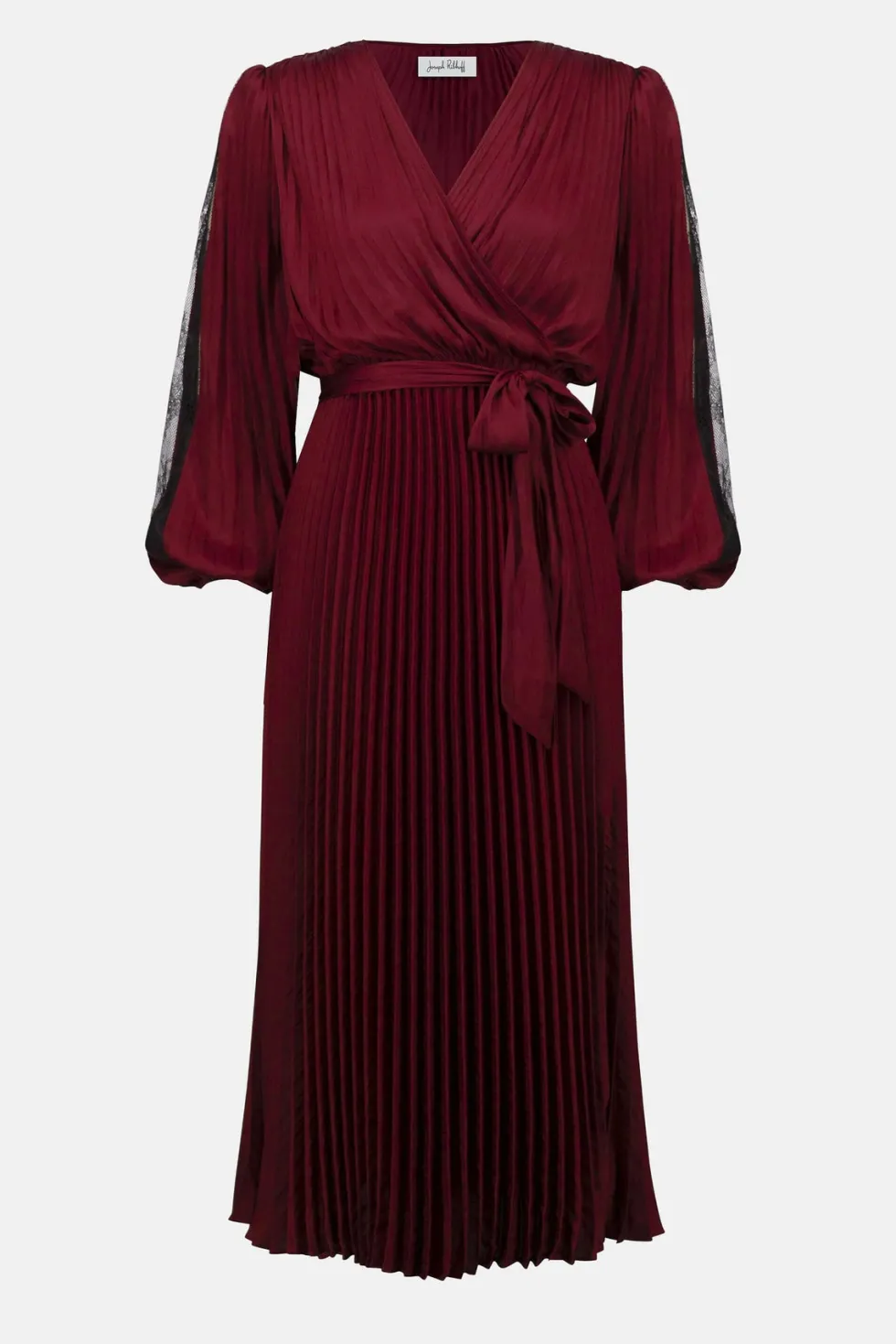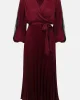 Signature | Pleated Satin Fit & Flare Dress 253775 by Joseph Ribkoff at The Wardrobe. Step into sophistication with this stunning fit and flare midi dress. Featuring a pleated satin design, a wrap neckline, and flowy dolman sleeves, it exudes timeless charm. The elastic waistband, accentuated with a sash, creates a