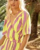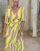 This yellow dress has a purple pattern of asymmetrical stripes. The dress has an elegant wrap detail with a ruffle and a tie belt at the waist. Thanks to the use of LENZING™ ECOVERO™ fabric, the dress fits smoothly and the item is 'more sustainable'.• Yellow dress• Wrap design• Purple wave pattern• Short butterfly slee
