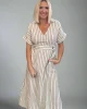 Midi dress with a V-neckline with faux wrap bodice, fold-up cuffs and in-seam pockets.Partially elasticized band with buttoned tabs. 70% Linen, 30% Polyester Gentle cold machine wash with like colours, using mild detergent. Do not rub/soak//wring/bleach. Do not tumble dry. Dry away from direct sunlight. Warm iron on r