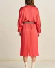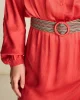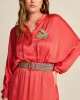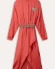 This red dress has a satin look in a beautiful red colour. The dress is finished with buttons and matching belt.• Midi dress• Comes with extra belt• Detachable brooch• Slanted slit in the middle• Long sleeves finished with buttonsFit: The dress is straight and comes roughly to the calf. The model in the photo is 173 c