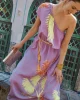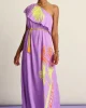 This purple dress has a handmade element inspired by the iconic gardens of Marrakesh. The dress has an elegant one-shoulder, finished with ruffles and a detachable tie belt at the waist. Thanks to the use of LENZING™ ECOVERO™ fabric, the dress fits smoothly and the item is 'more sustainable'.• Purple dress• Asymmetrica