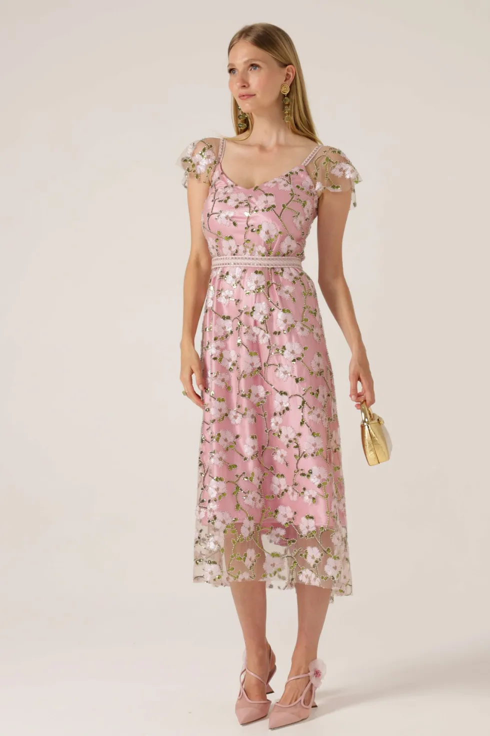 Anna's Hummingbird Dress Sacha Drake At The Wardrobe Step into spring with the elegant Anna's Hummingbird Dress. Crafted with intricate beaded mesh over satin, this dress features delicate flute sleeves and a removable beaded belt for a customisable silhouette. It combines femininity and subtle glamour, perfect for yo