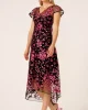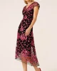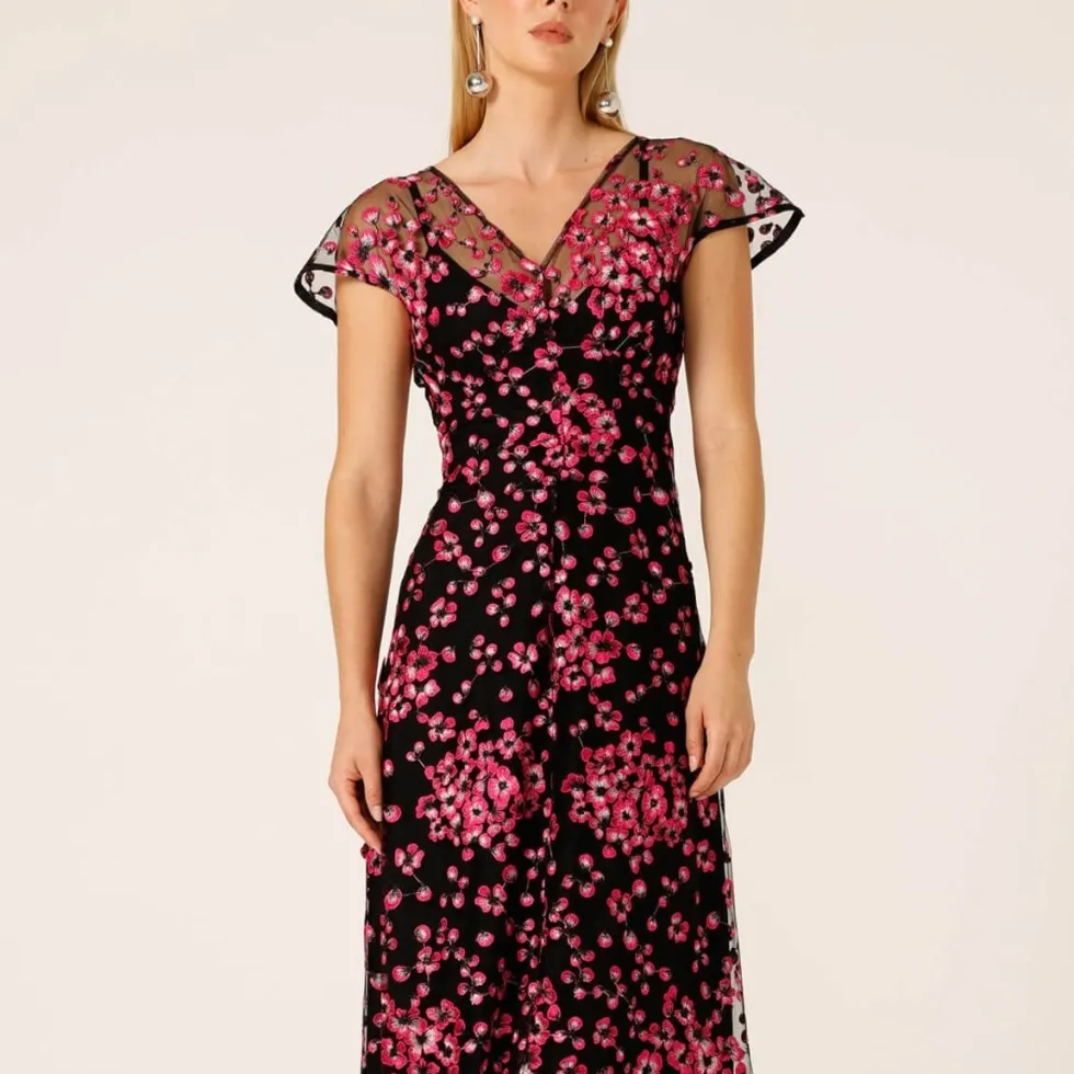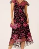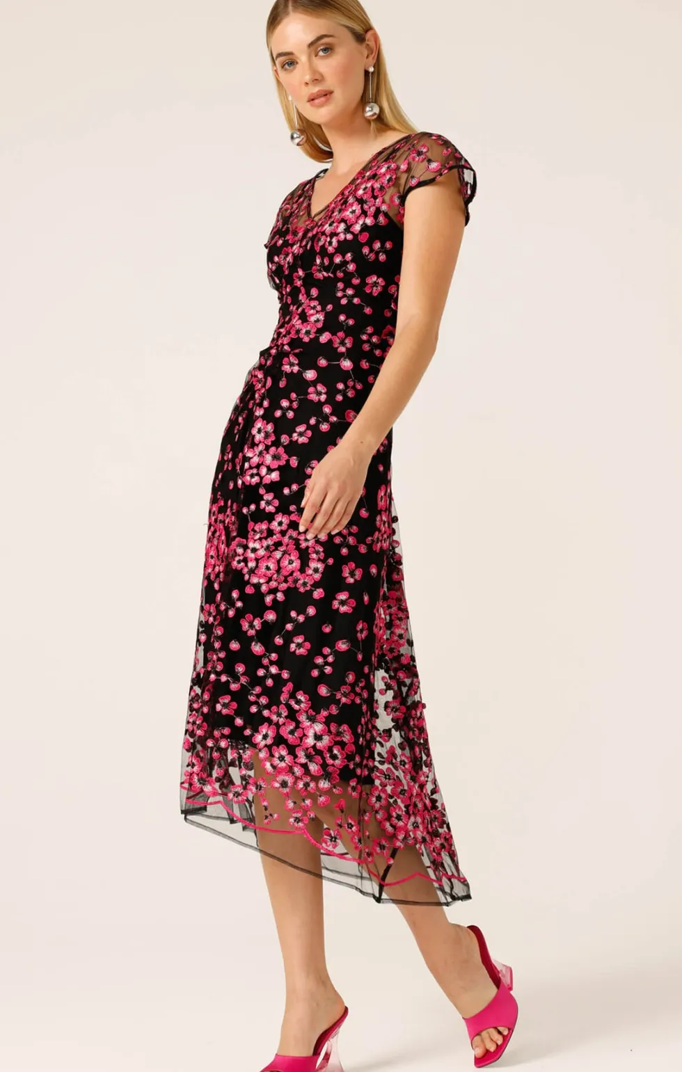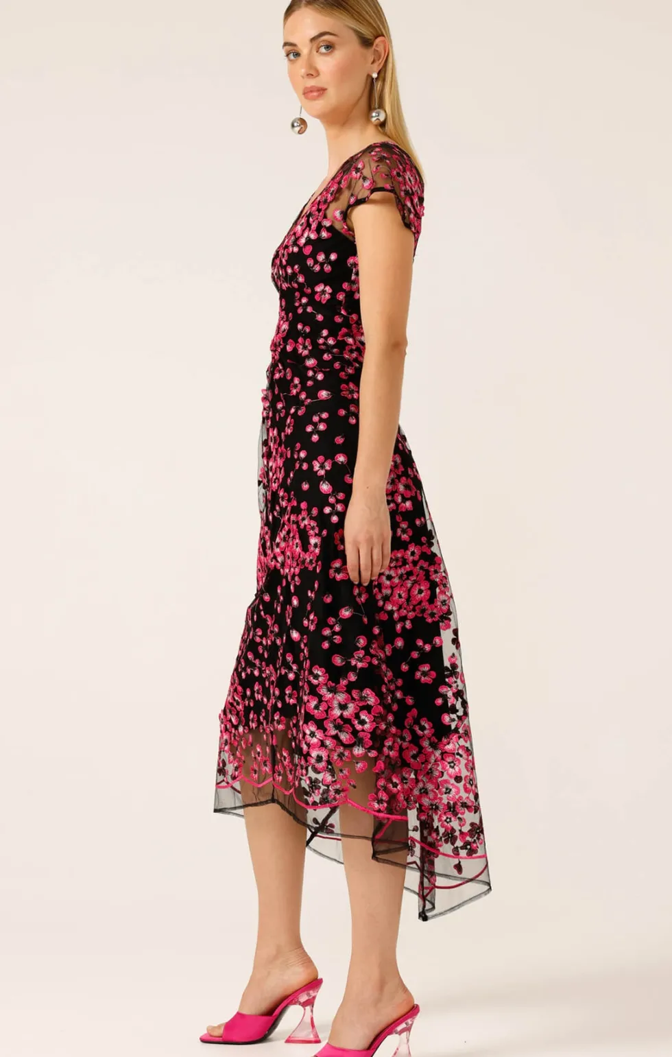 This is a sale item and is only eligible to return for a store credit or exchange. Joan Orchid Dress by Sacha Drake at The Wardrobe. Pretty and feminine, the Joan Orchid Dress will make you feel beautiful. The dress boasts a rich palette of pink and black florals. The sheer sleeves with intricate embroidered detail and