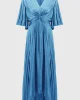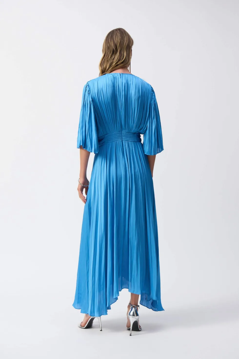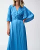 Hero Pleated Satin Midi Dress – Coastal Blue 251903 by Joseph Ribkoff at The Wardrobe. Crafted from a divine woven satin this midi dress pairs soft pleated elbow sleeves with a flowy trapeze silhouette. A knotted waist detail adds oomph and definition, while a lovely v-neck complements the decolletage. 100% Polyester W