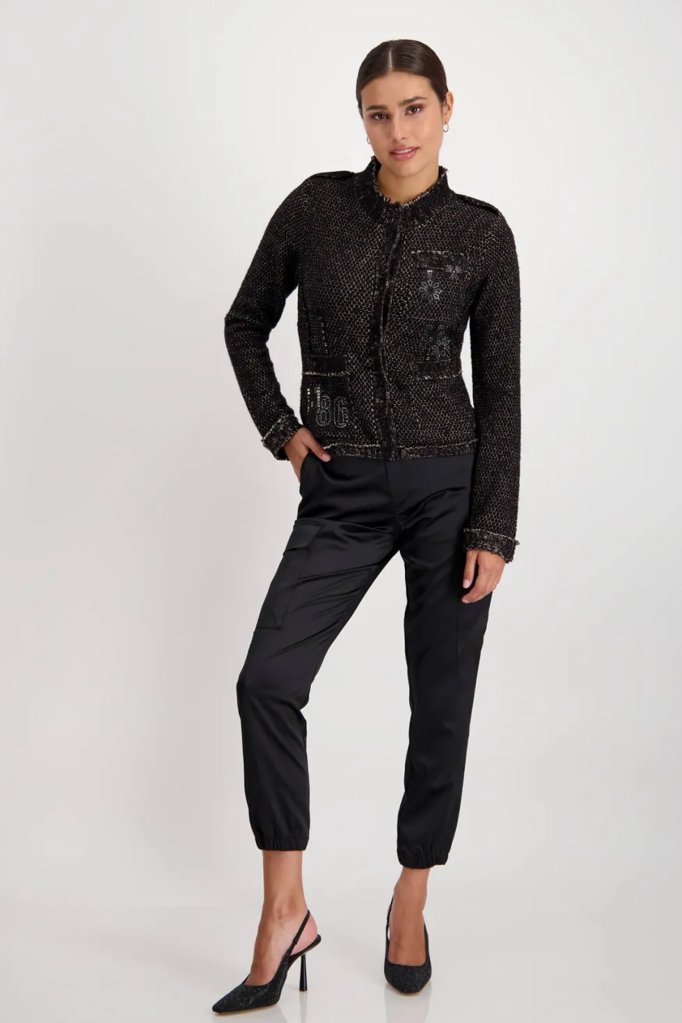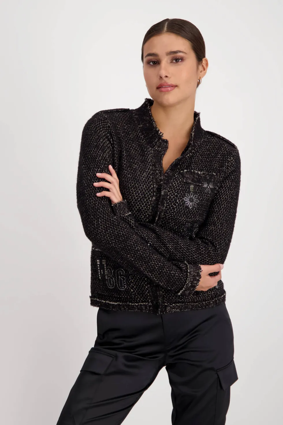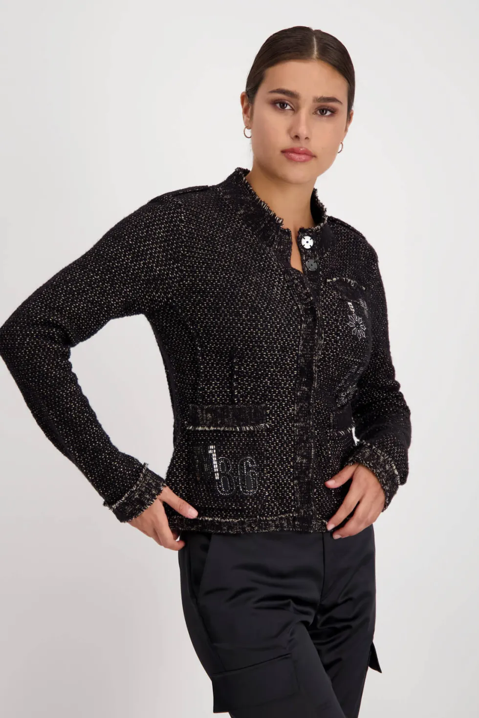Knit Patches Jacket – Black 807364 by Monari at The Wardrobe. 30% Cotton; 28% Acrylic 18% Wool; 12% Polyamide 12% Metallized Polyester