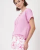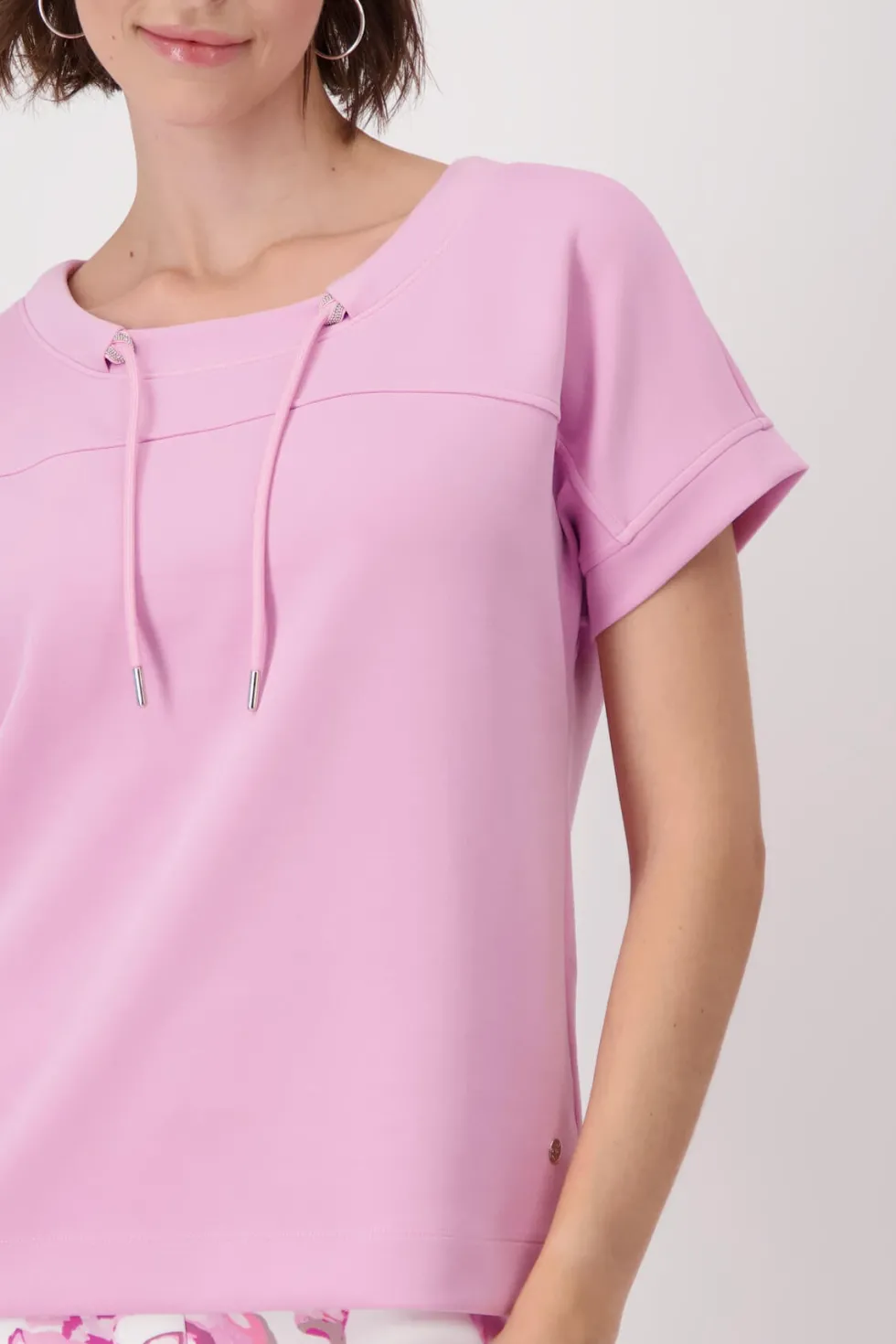 Embellished Sweatshirt – Bubblegum 409363 by Monari at The Wardrobe. Modal blend Stretchy material Sweatshirt Soft feel Regular fit Stand-up collar with eyelet charm and drawstring Slightly oversized short sleeves Sleeve cuffs Logo plate The model is 1.80 m tall and wears size 36. The length of size 38 is 60 cm. This s
