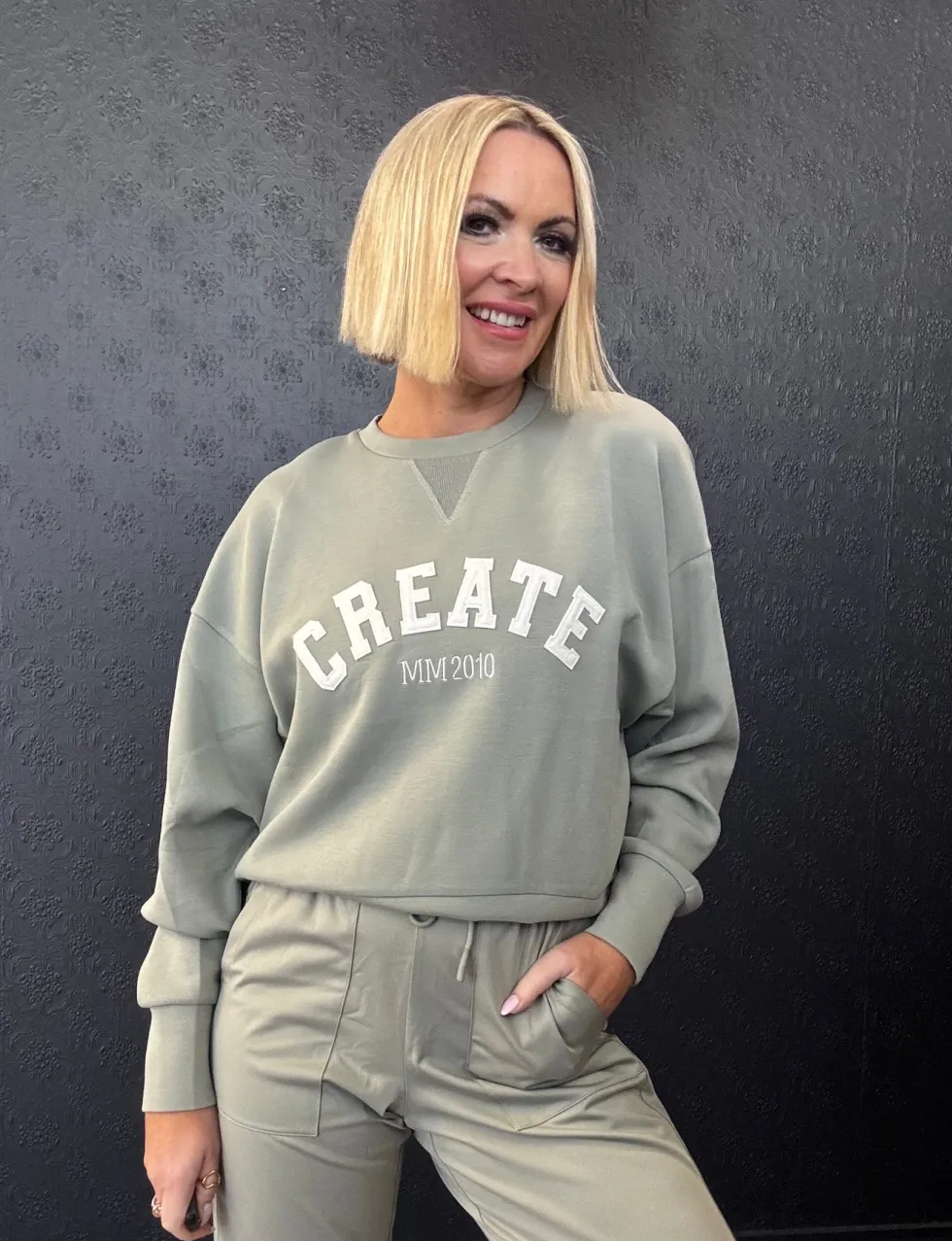 Celli Sweat Shirt – Shadow Sage 168550 by Mos Mosh at The Wardrobe. Achieve effortless cool with this must-have sweatshirt, featuring a relaxed fit, drop shoulders, and bold chest lettering. With its voluminous sleeves and preppy, retro college vibe, it pairs perfectly with dark blue denim for a standout look. 80% LEN