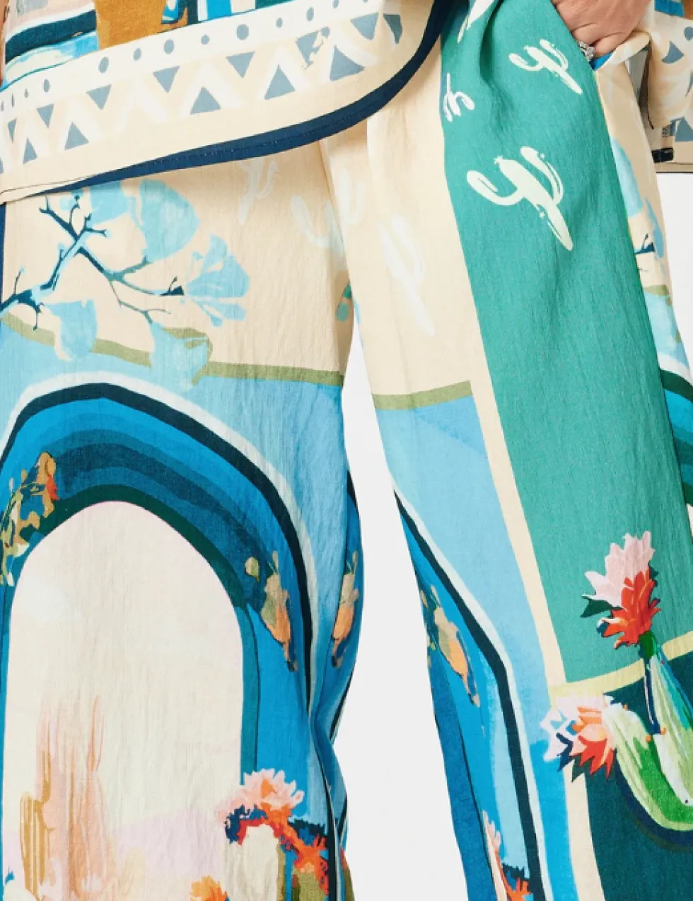The Tulum Print Wide Leg Pant – Blue/Multi 48329 by Clarity at The Wardrobe Features: Experience effortless style with the Tulum Print Wide Leg Pant in Blue/Multi. Crafted from soft, flowing fabric, these pants showcase a vibrant print inspired by the Mexican blue skies and desert. The cotton rib waistband ensures all-