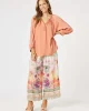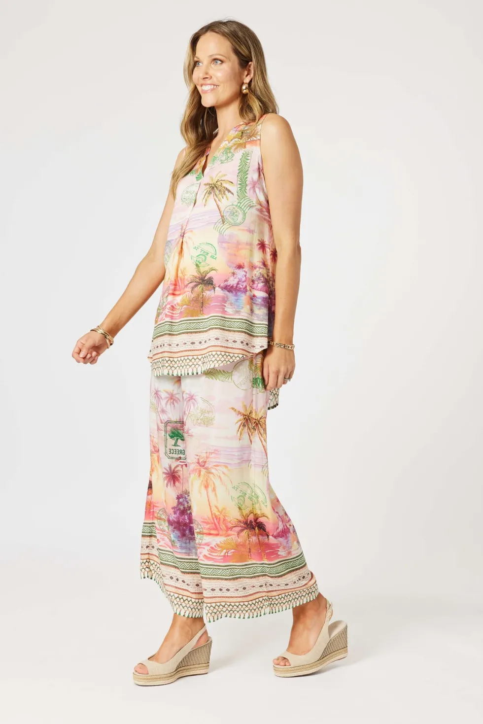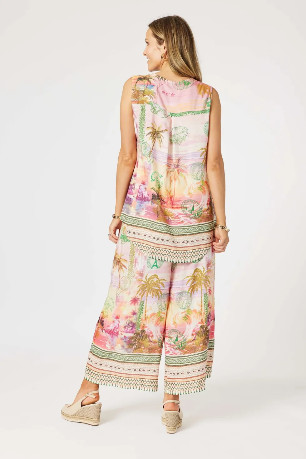 Passport Pant 48188 – Sunset Multi by Hammock & Vine at The Wardrobe Features: The Passport Print Pants are a vibrant, getaway-ready style designed to bring a touch of wanderlust to your wardrobe. Made from a lightweight fabric, these wide-leg pants feature a scenic postcard-inspired print in sunset hues, complete