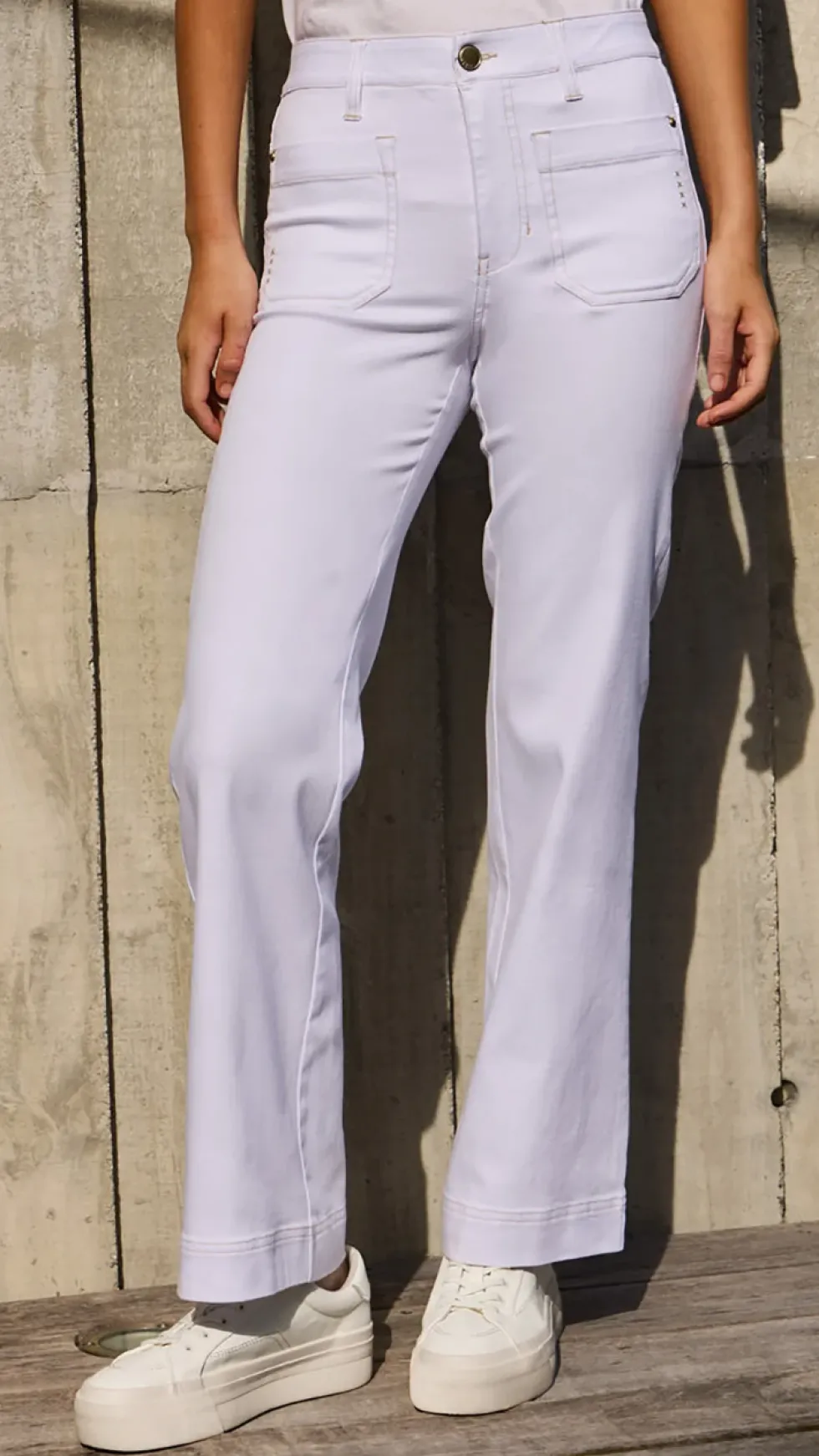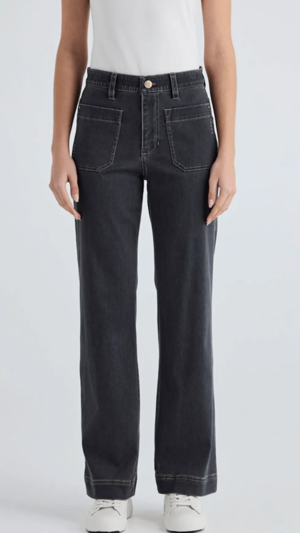 Chrome Jean – Charcoal 3764 by Lania The Label at The Wardrobe The Chrome Jean offers a wide-leg silhouette crafted from the softest stretch denim for unmatched comfort and style. Featuring front patch pockets adorned with cross-stitch embroidery. The deep hems allow for a lovely drape, making these jeans a wardrobe es