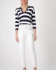 Seaside Couture Jogger Pants – Milk – 409210 by Monari at The Wardrobe. Flowing viscose Stretchy material Jogging bottoms Rhinestones Patch Letter M Elasticated waistband with drawstring Normal rise In-seam side pockets with zip Back patch pockets Trim at the leg end The model is 1.77 m tall and wears size 34. The in
