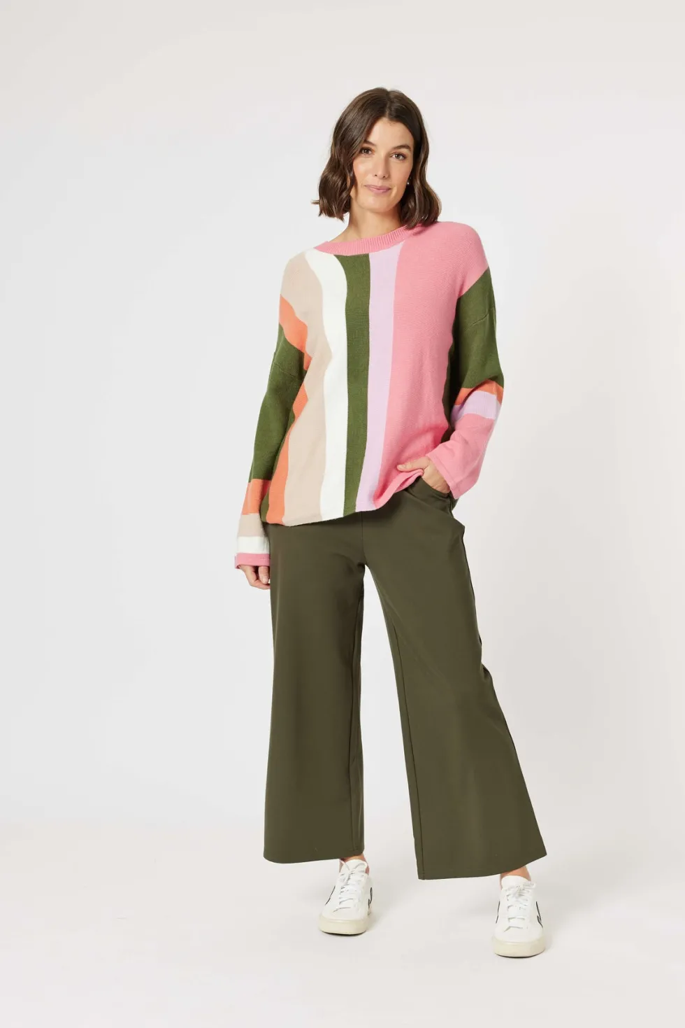 42467 – Kimmy Ponte Wide Leg Pant by Clarity at The WardrobeFeatures: Viscose/Nylon/Elastane Pull on style Pockets Super stretch fabric Deep elasticated waistband for tummy support Fit Guide: Wide leg design Cropped style High rise True to size