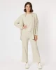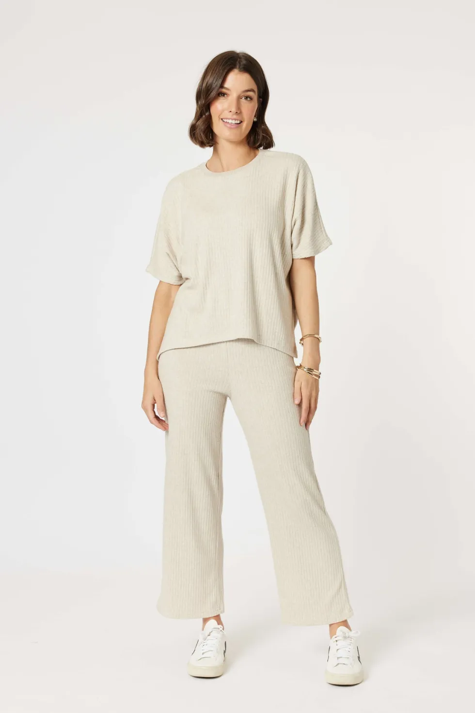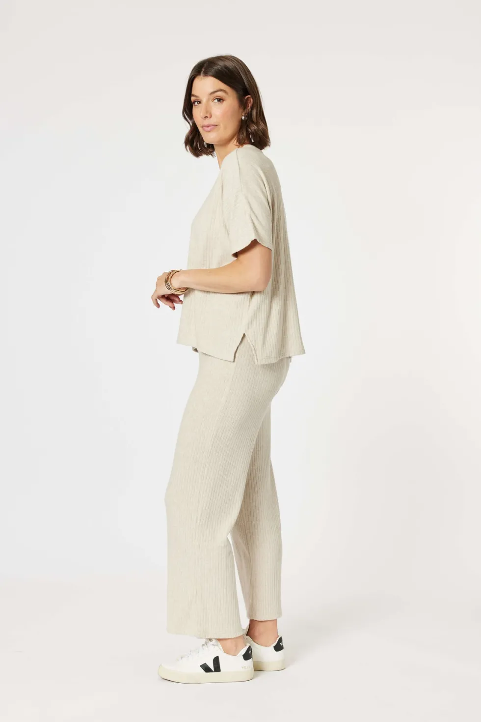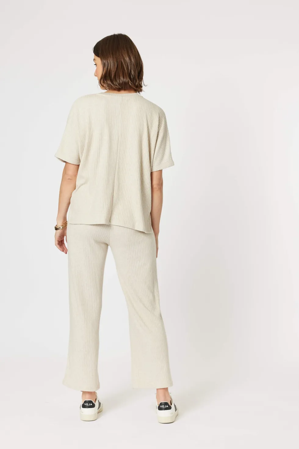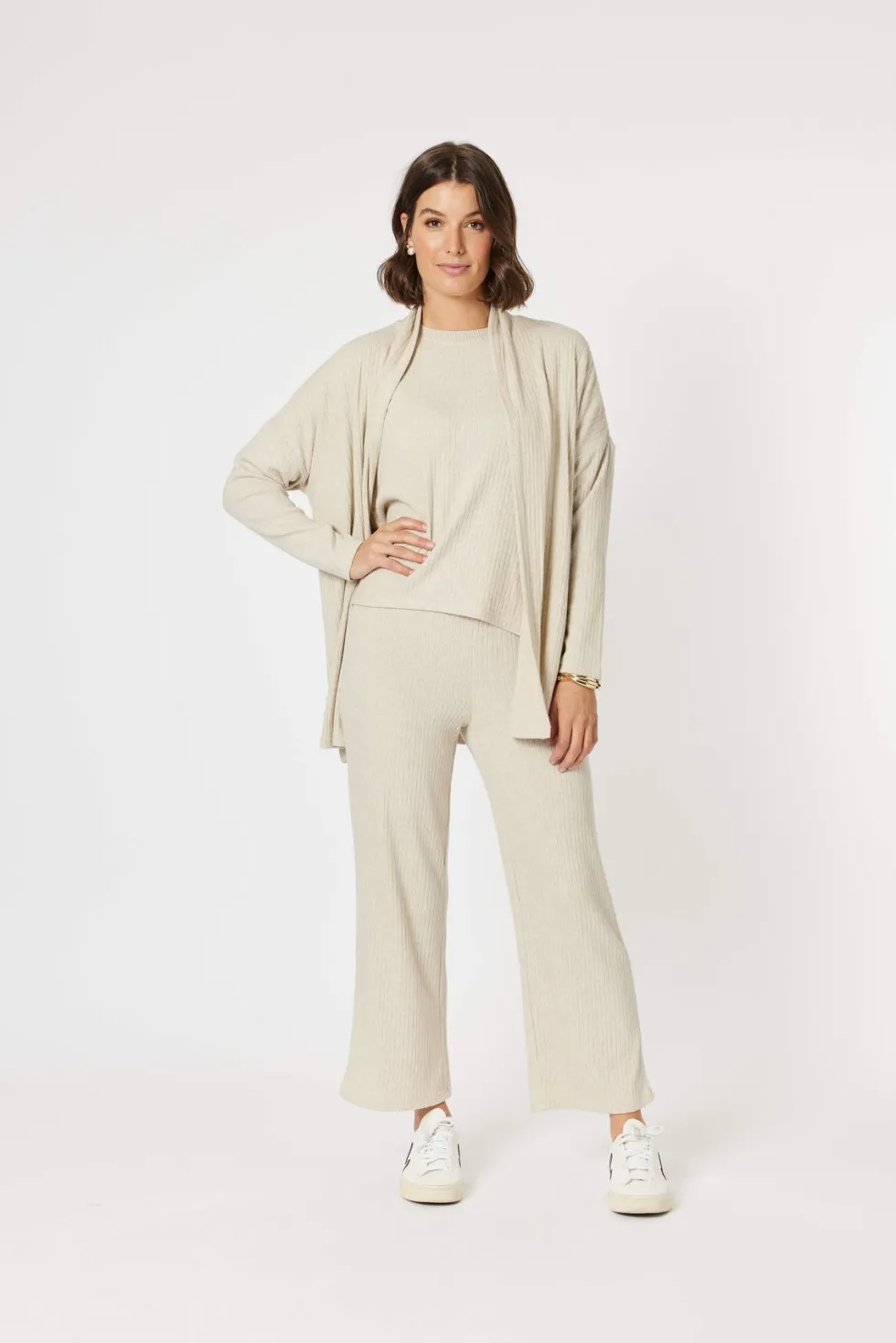 Lounge Pant by Clarity at The Wardrobe 50% Viscose 30% Polyester 16% Acrylic 4% Elastane Cold hand wash separately. Do not soak, bleach or wring. Do not tumble dry. Dry flat in shade. Cool iron only. Dry cleanable. Soft ribbed knit fabric Soft and cosy to wear Easy pull-on style Super comfortable elastic waist Straig