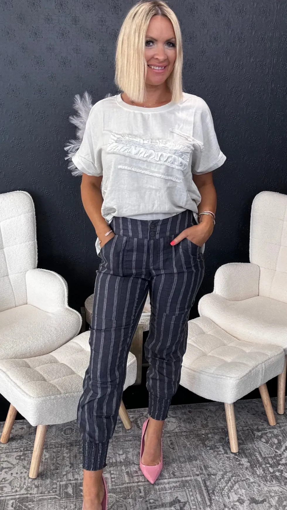 Work Smart Pant – Navy Stripe 7886 by FOIL available at The Wardrobe 100% Linen