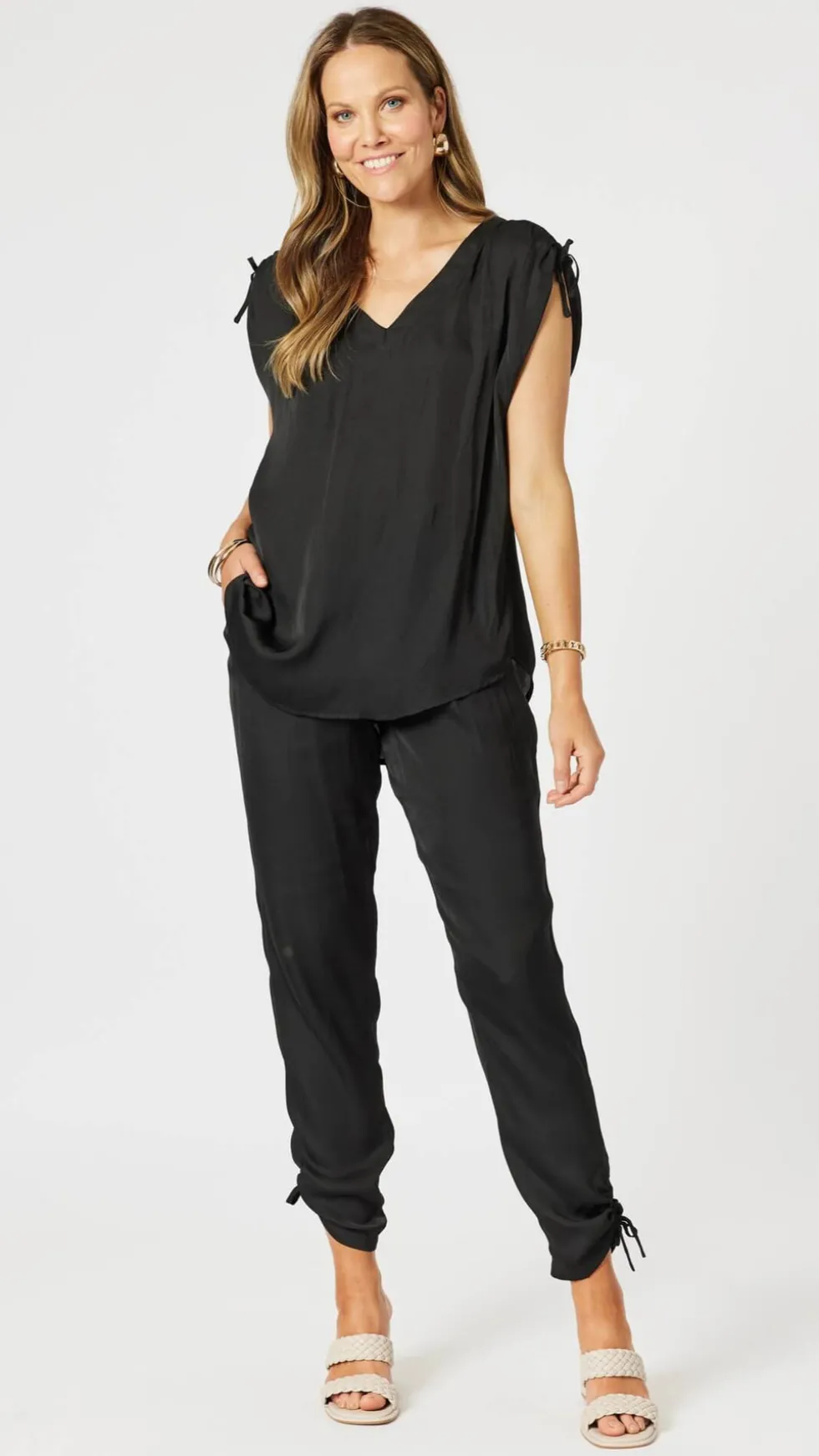 Traveller Luxe Side Tie Pant – Black 46142 By Hammock & Vine at The Wardrobe Features: So soft you would think you're wearing silk But of course we can wash these at home Designed to "Travel" with your life This is the pant you roll up and takes up no space in your luggage It is super quick, drying fabric, so wash