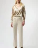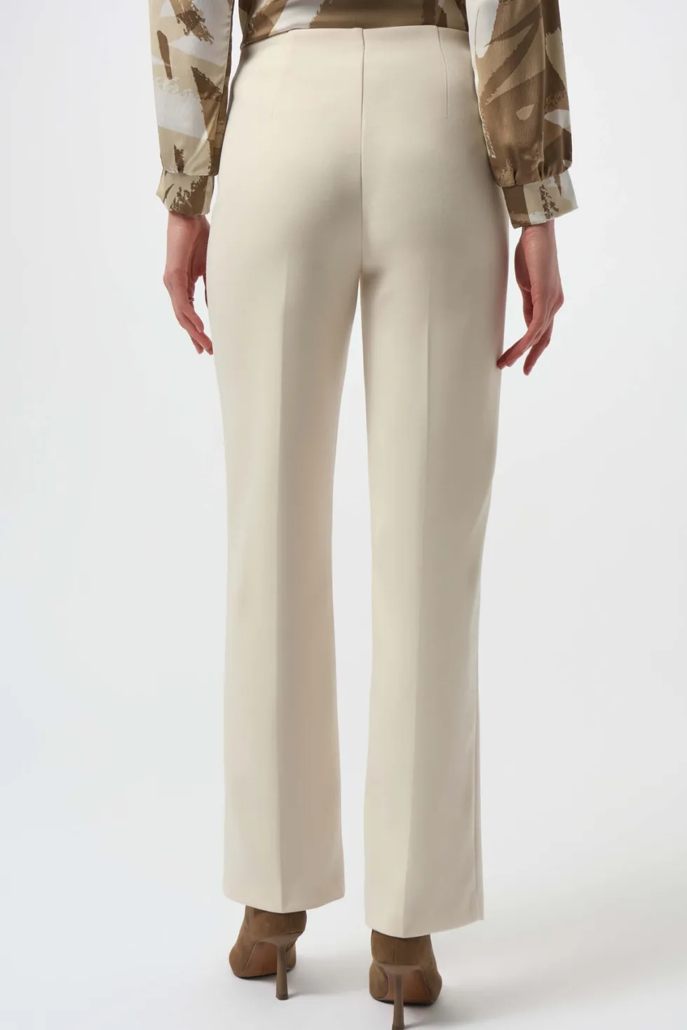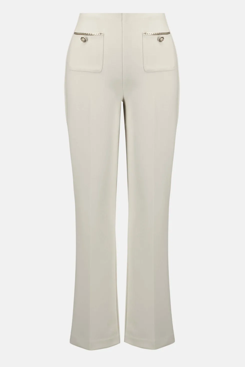 Dusk to Dawn Scuba Crepe Straight Pull On Pant – Birch 254043 by Joseph Ribkoff at The Wardrobe. These scuba crepe pull-on pants are tailored in a classic straight silhouette that flatters any figure. The front applied pockets with gold embellished details and buttons elevate the garment’s polished look. 95% Polyester