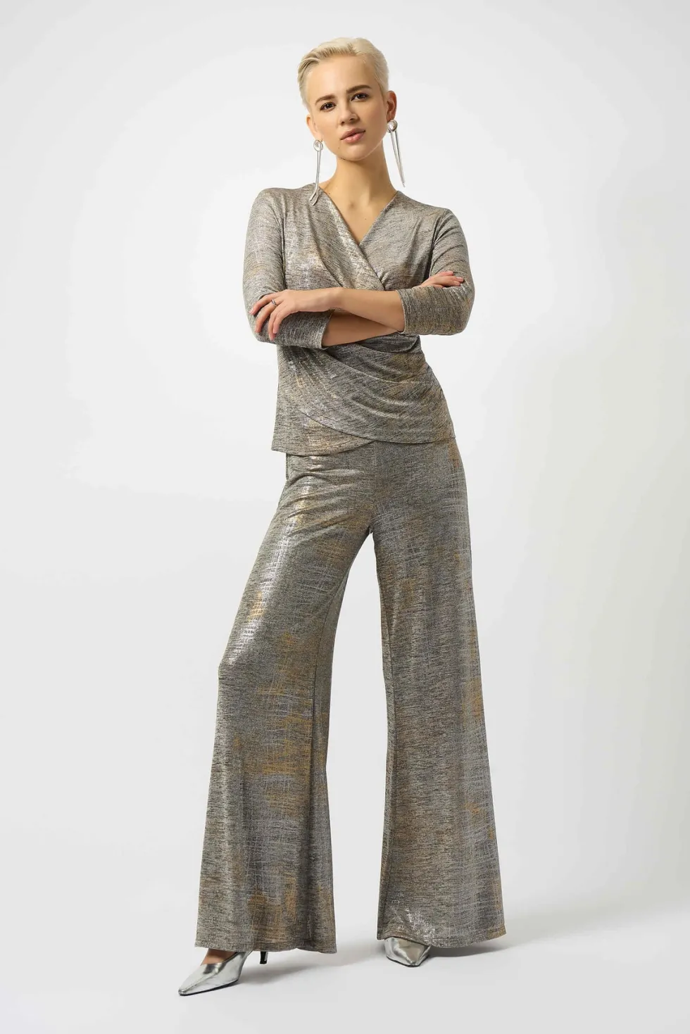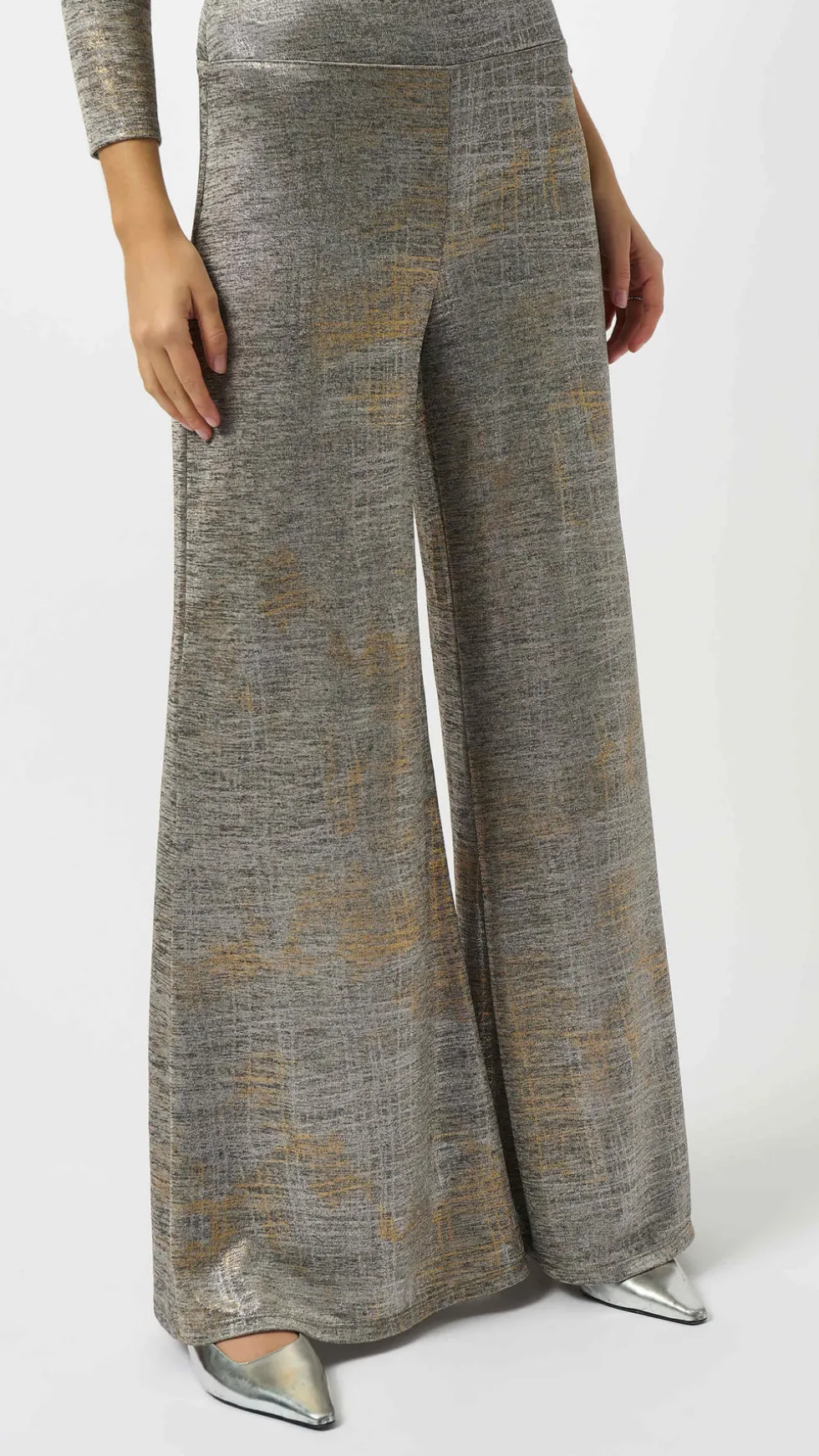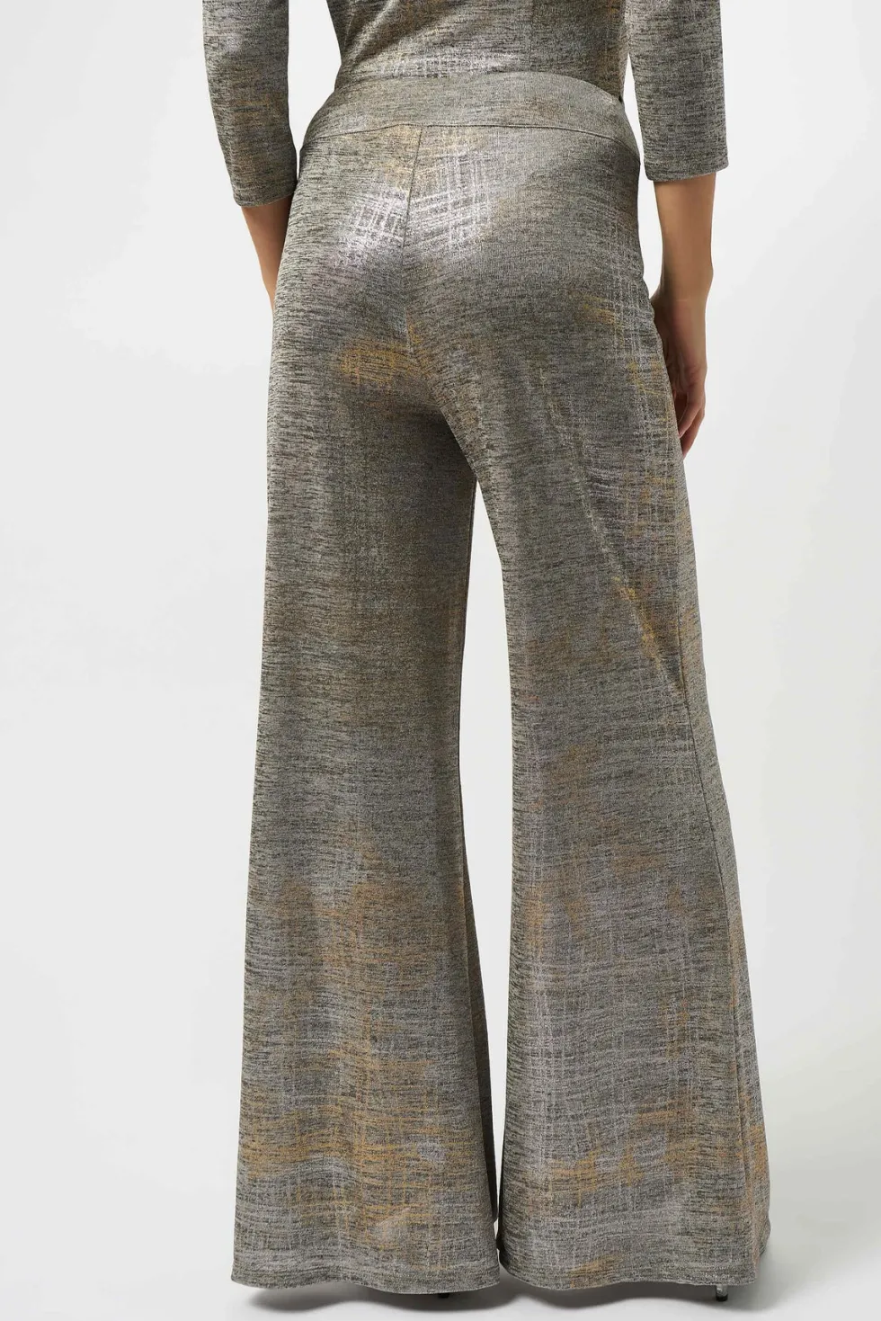 Supernatural Foiled Melange Knit Wide-Leg Pants – Beige 253274 by Joseph Ribkoff at The Wardrobe. These mélange knit pull-on pants make a statement with their shimmering foiled finish. The wide-leg silhouette accentuates every step with poise and dramatic flair. The soft contour waistband ensures a comfortable fit, whi