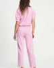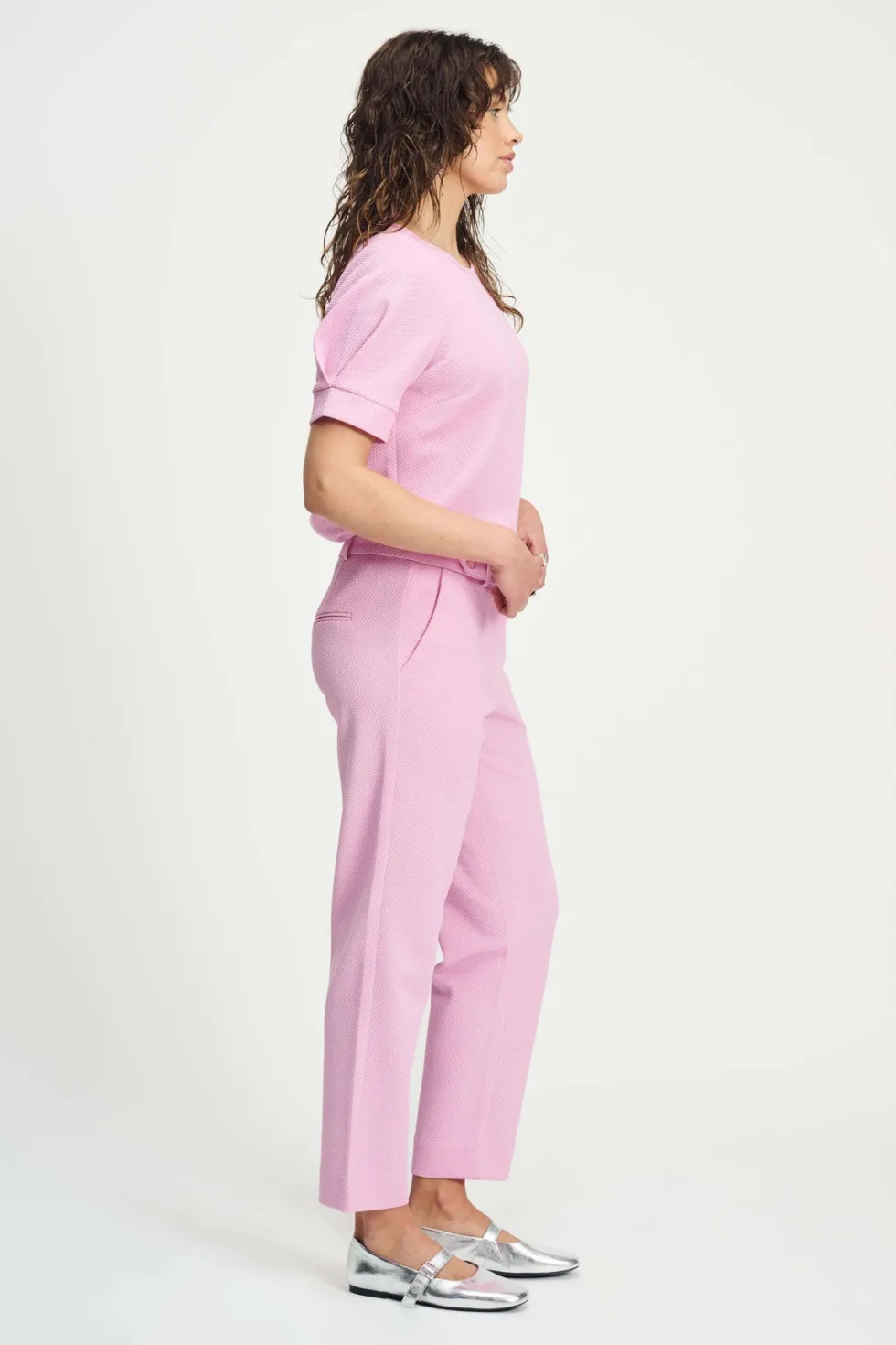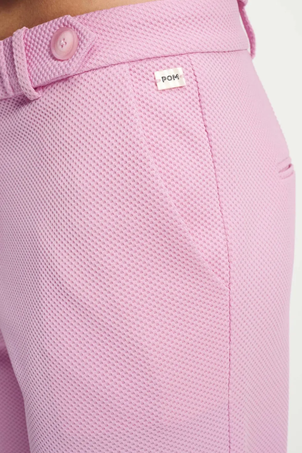 Tapered Pant – Rose 9104 by POM Amsterdam at The Wardrobe Discover the new model of the popular Piqué fabric in pink. The fabric is made of recycled polyester, making these pants 'more sustainable'. The waistband is finished with decorative buttons for a chic look. • Pink pants • Decorative buttons on the waistband • T