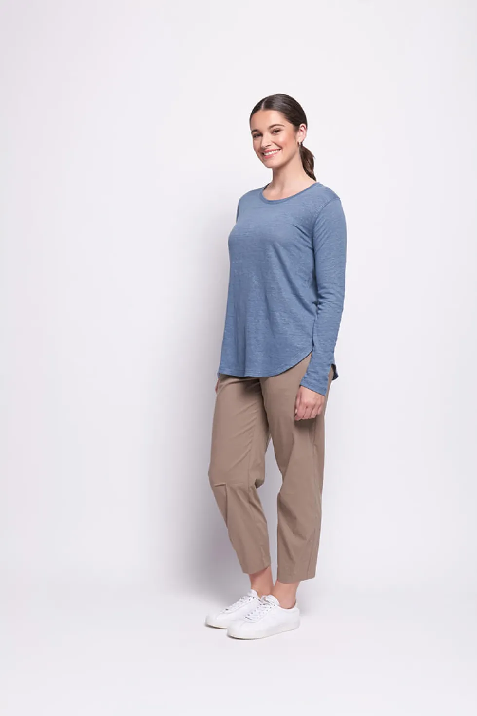 Long Slim Trapeze Pant – Latte by Foil at The Wardrobe 69% Cotton, 27% Nylon, 4% Elastene Elastic Waist , Pull on. Machine Washable . Do Not Dryclean