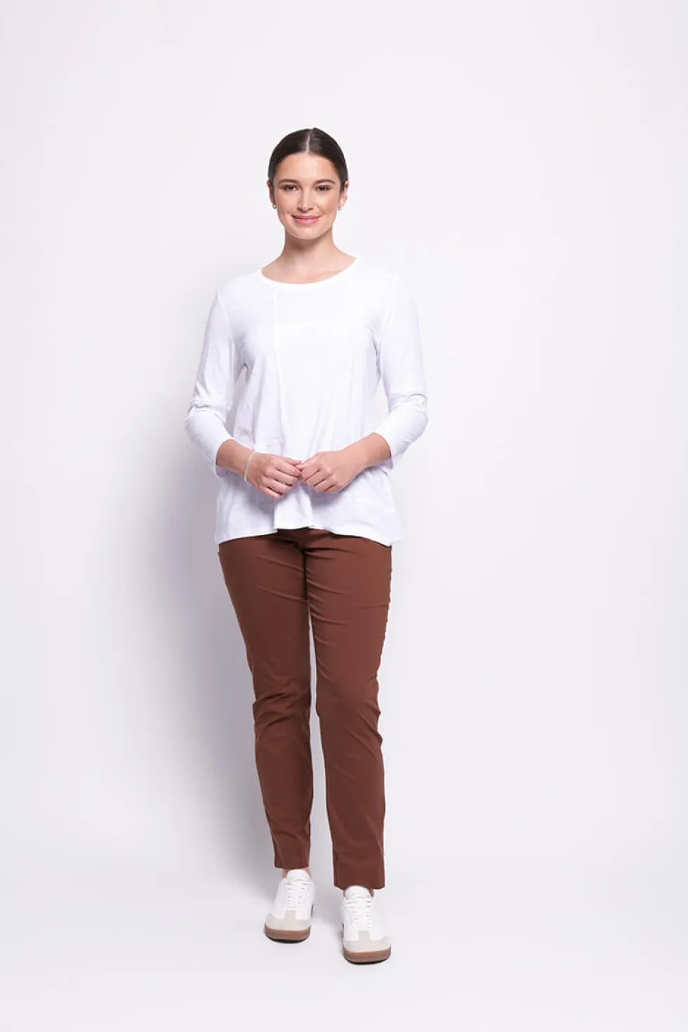 Long Slim Trapeze Pant – Sepia by Foil at The Wardrobe 69% Cotton, 27% Nylon, 4% Elastene Elastic waist band and pull on. Lovely light fabric. Machine Washable . Do Not Dryclean