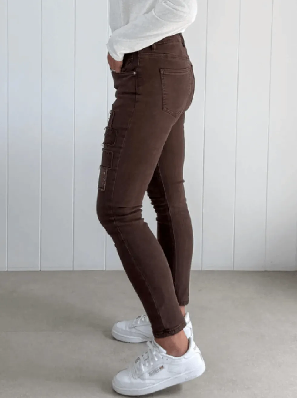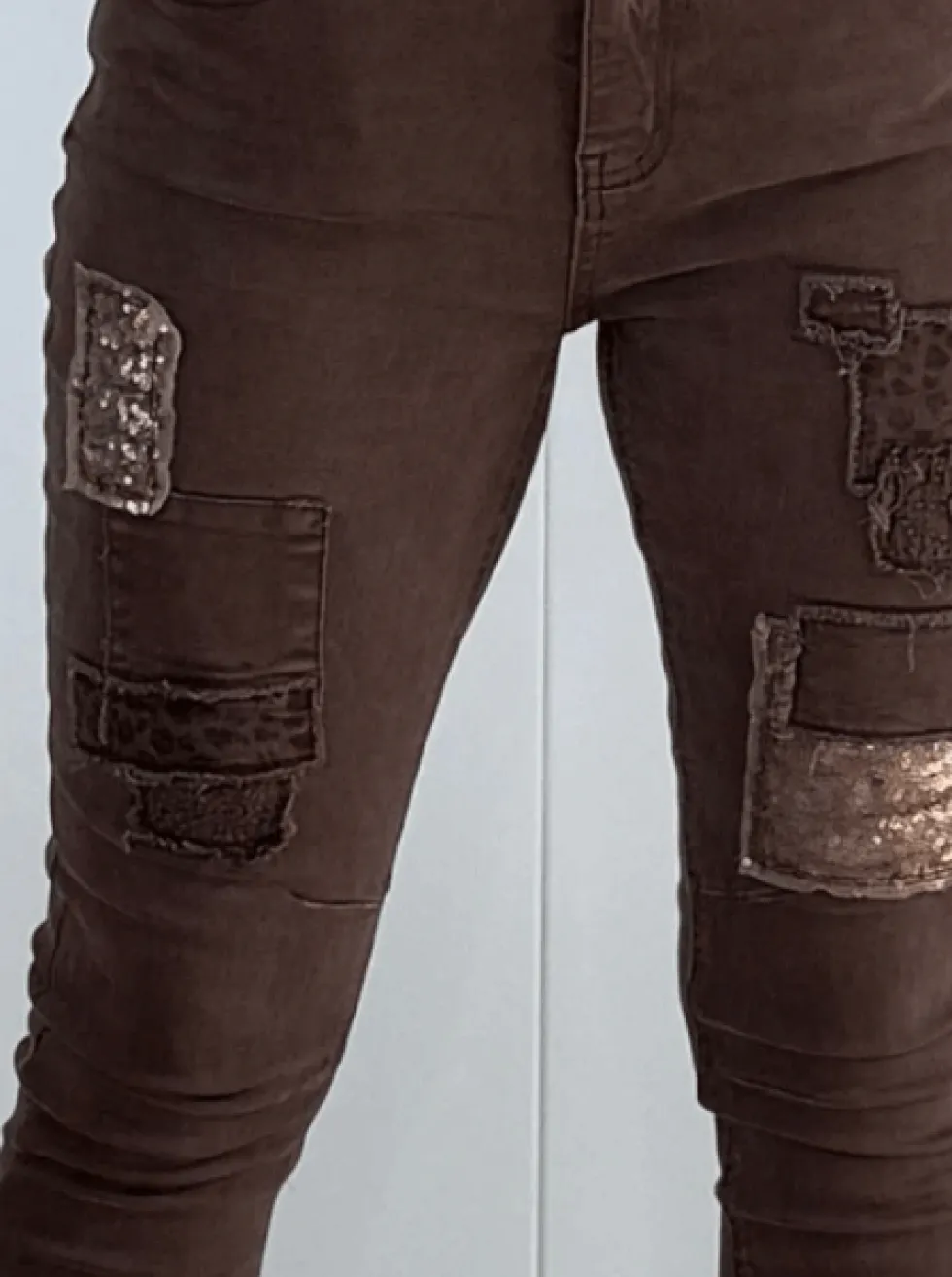 All That Jazz Applique Jean – Chocolate 43795 by Threadz at The Wardrobe Applique patch design Washed denim look Classic 5 pocket jean style Zip fly High rise Slim leg fit Stretch fit Ankle length This super stretch jean has so much room to move that we suggest you buy down a size