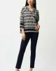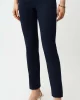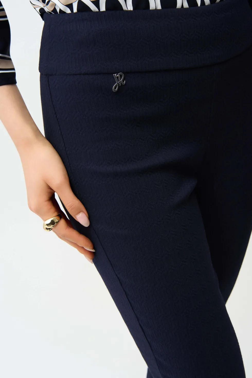 Blue Horizon Jacquard Straight Pull On Pants – Navy 261148 By Joseph Ribkoff at The Wardrobe. 22% Nylon, 4% Spandex, 74% Viscose rayon Jacquard woven fabric Structured contour waistband Side vents at leg and JR ornament at front waist Unlined Do not iron Hand wash in cold water with like colors Hang to dry in the shade