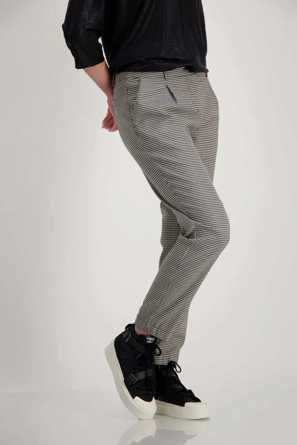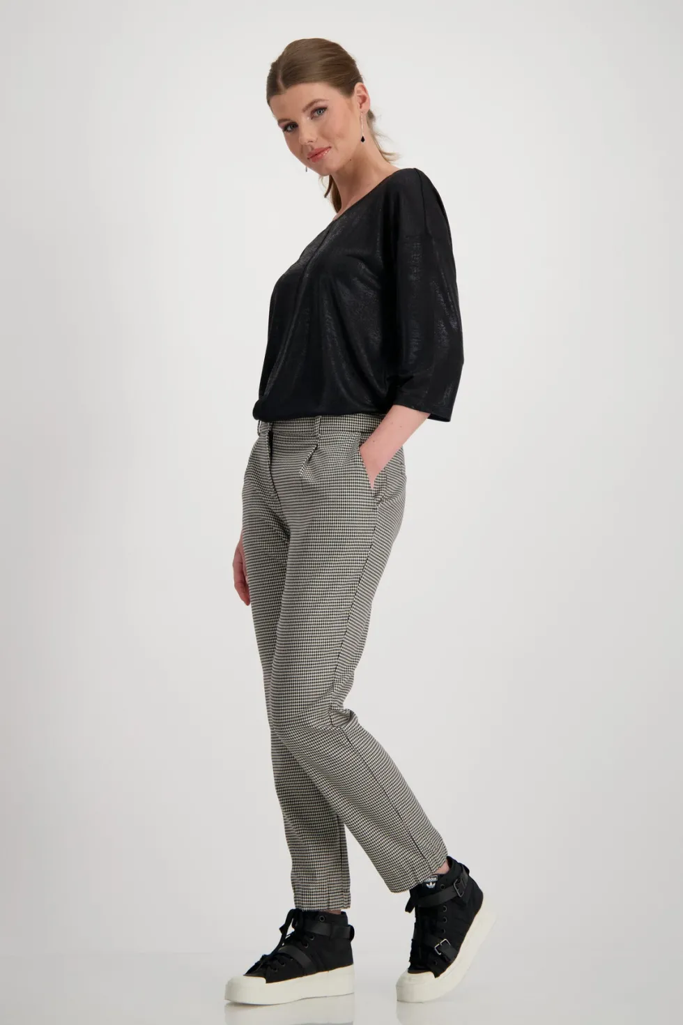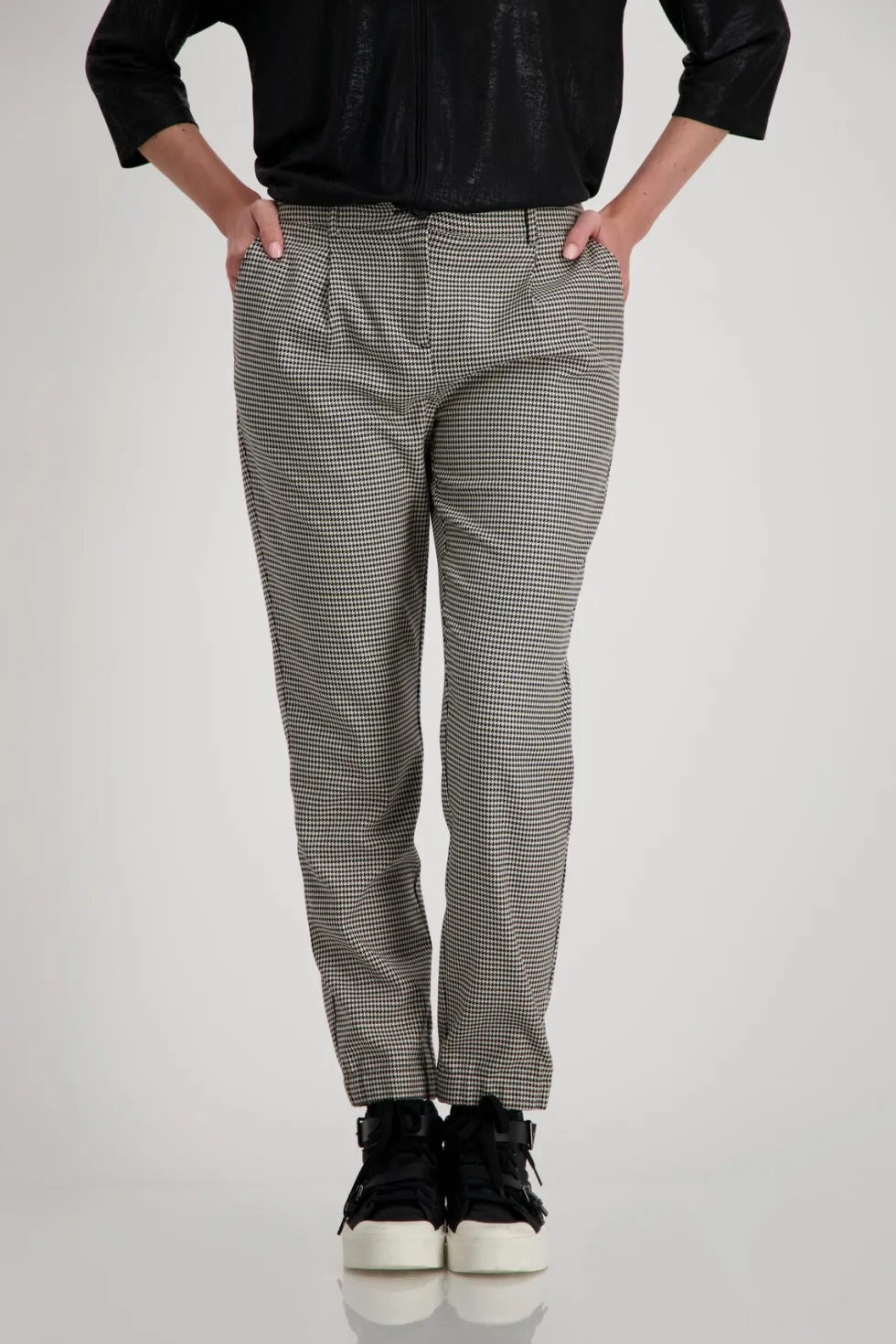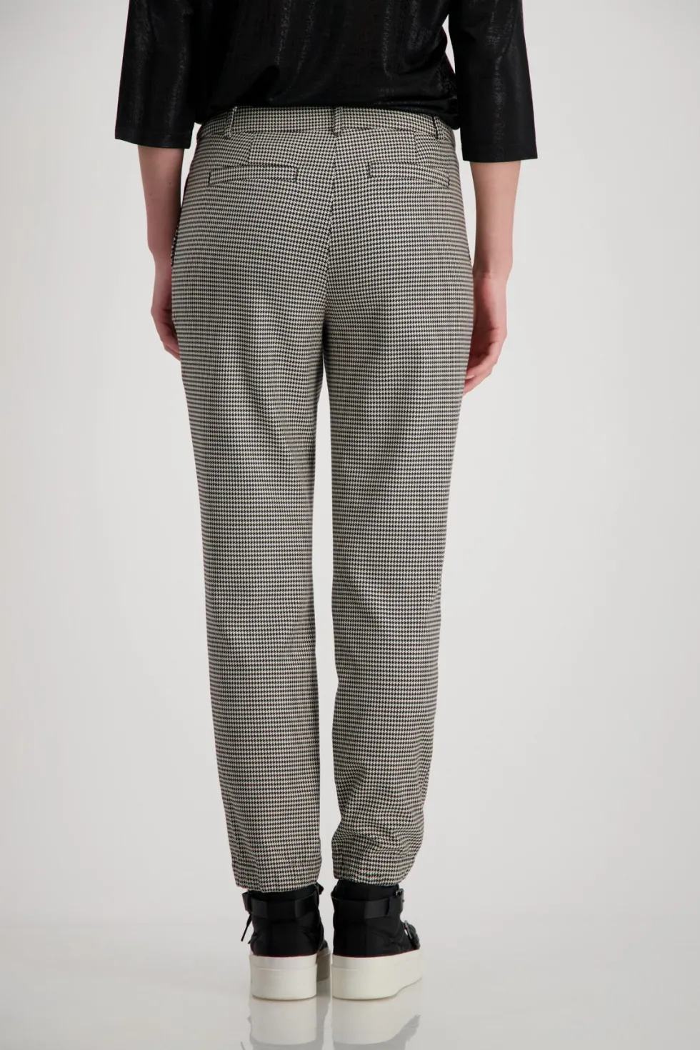 Schwarz Business Trouser – Houndstooth 807815 by Monari at The Wardrobe. 64% polyester; 34% viscose; 2%Elastane These elegant houndstooth trousers are perfect for the business look and also have practical pockets. Viscose blend; Elastic material; Houndstooth; In-seam pockets; Fake back pockets; Hem with concealed, elas