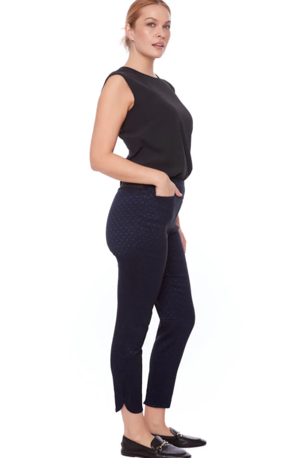 Petal-Slit Techno Ankle Pant – Blue/Black Blaze 68230 by Up Pants at The Wardrobe Dial up the drama with a dose of understated glam. The Blaze pant exudes a fierce femininity with stylish swagger, featuring an elegant geometric and a subtle, sultry sheen. Rendered in deep navy hues, the tonal look is less severe than c