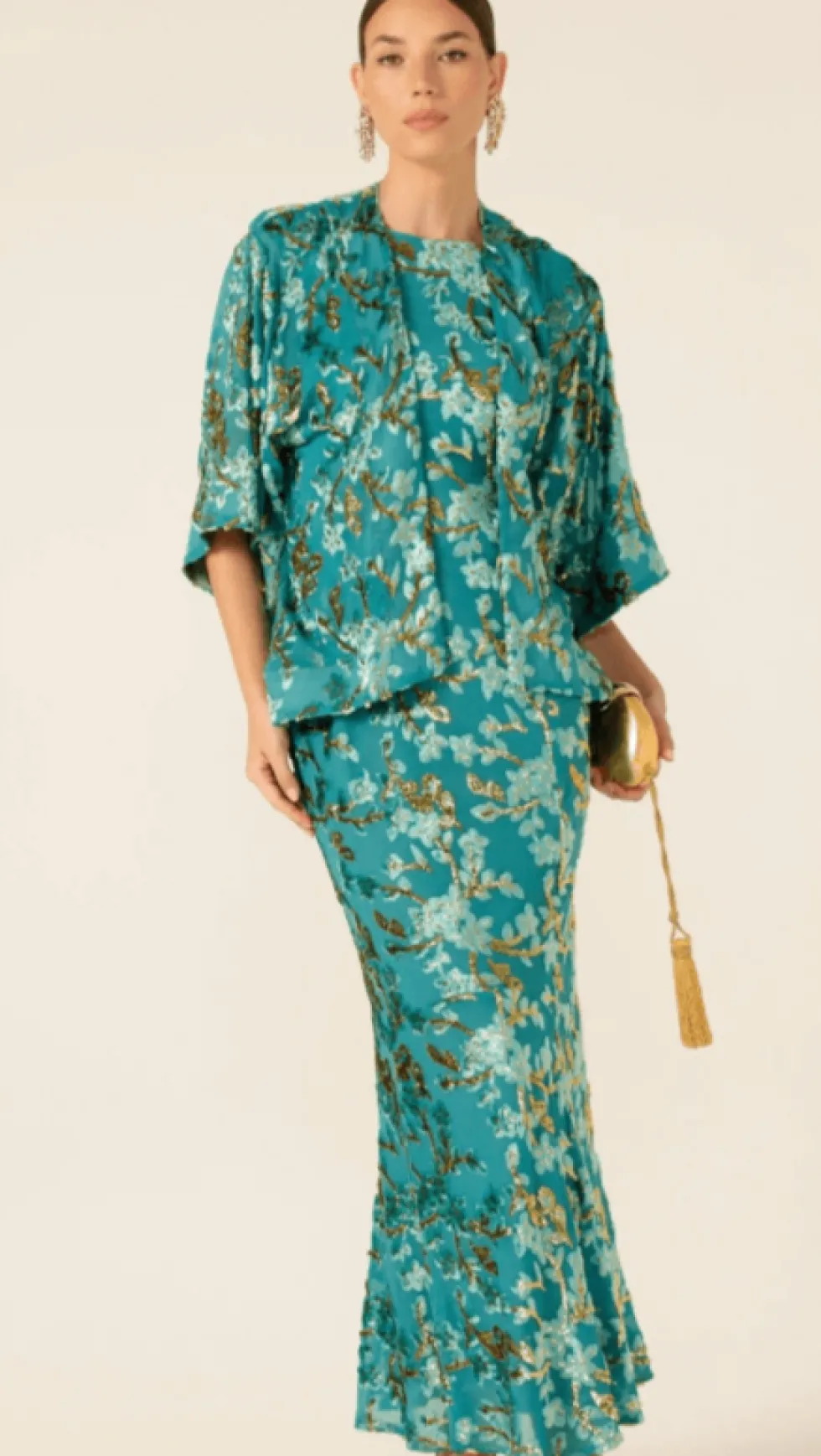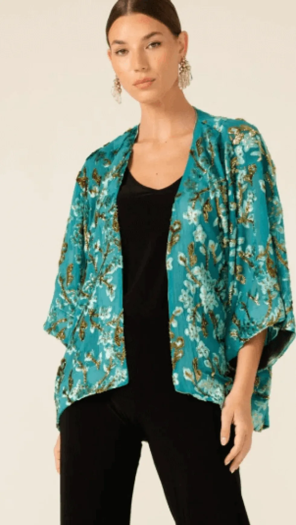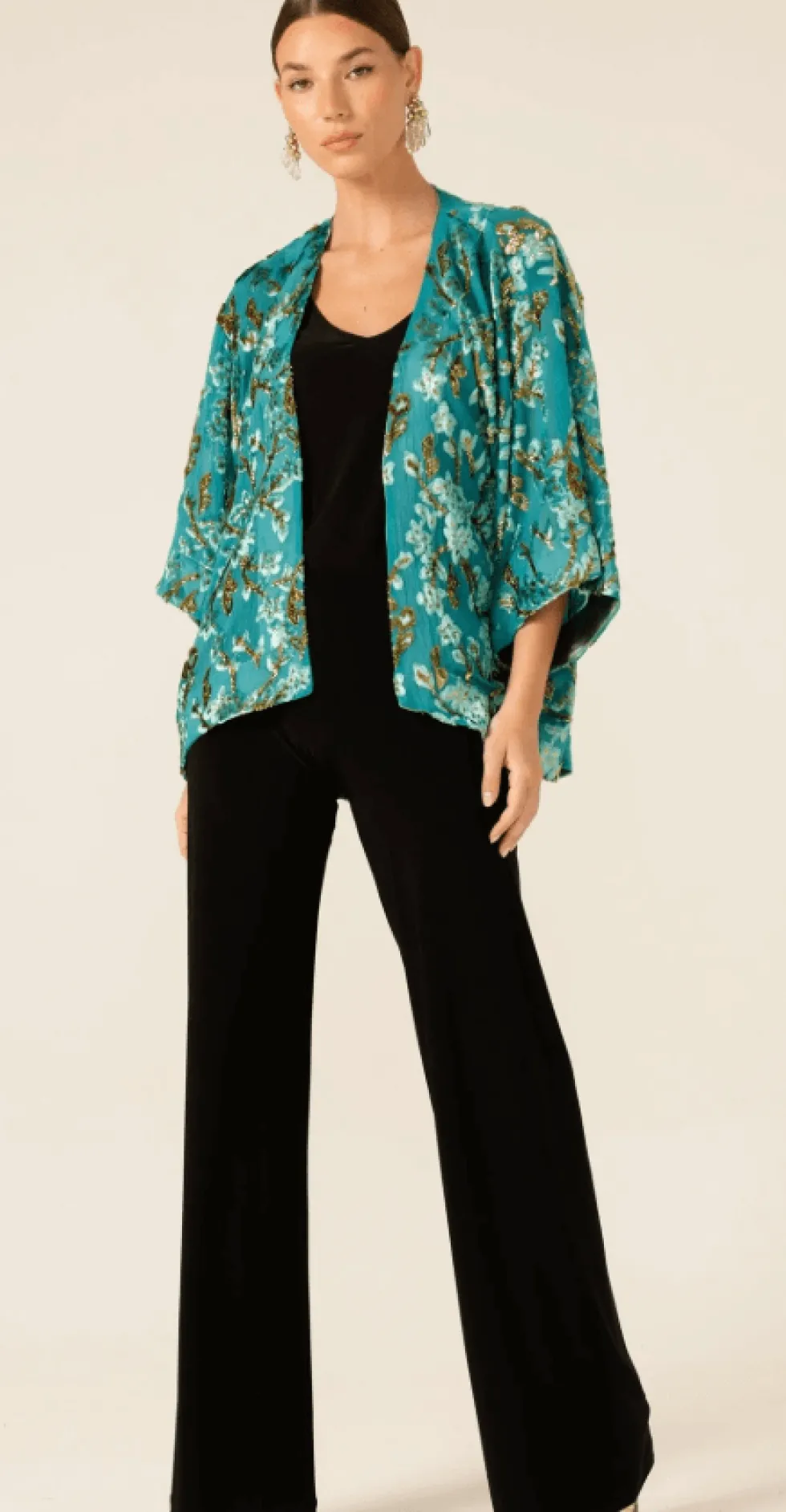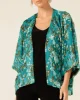 Blossom Kimono In Turquoise by Sacha Drake at The Wardrobe The Blossom Kimonois a versatile layering piece, crafted from a luxurious lightweight textured fabric with raised detailing for a touch of elegance. With an open front and 3/4 kimono sleeves, it’s the perfect addition to dresses, skirts, and pants for special