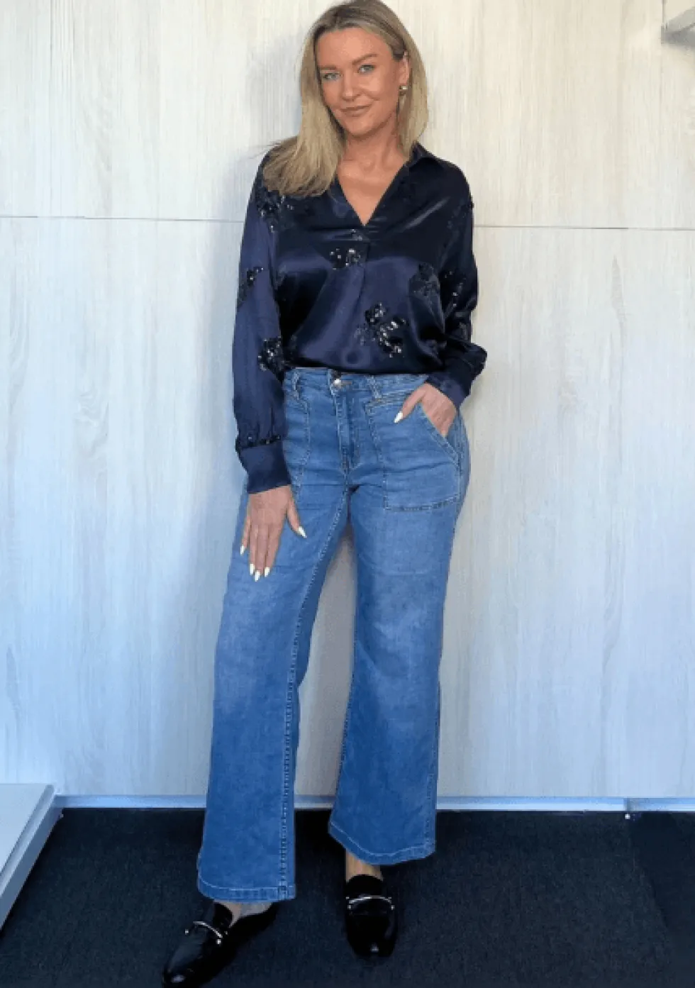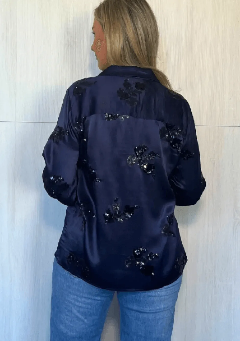 After Dark Shirt – Midnight Blue 47272 by Hammock & Vine at The Wardrobe Experience luxury and elegance with our After Dark Shirt. The silky soft fabric, delicate floral sequin details, and classic collar will make you feel sophisticated and stylish. Unleash your inner fashionista and elevate your wardrobe with th