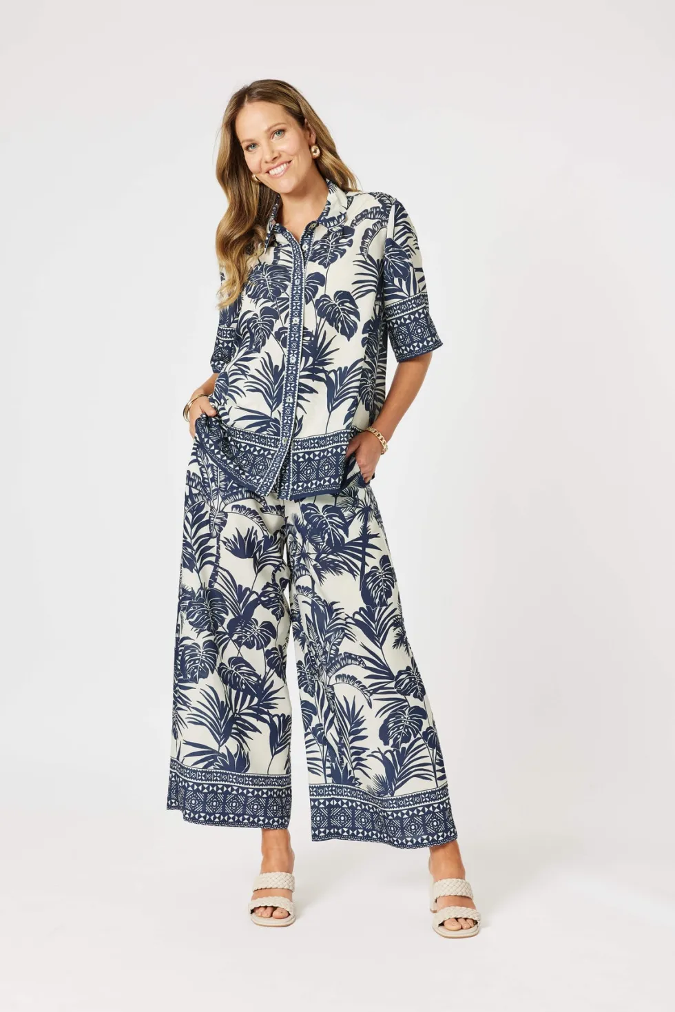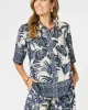 Palm Cove Shirt – Navy Multi 48161 by Hammock & Vine at The Wardrobe. Features: Effortless and versatile, the Palm Cove Shirt is your go-to for relaxed sophistication. Showcasing a striking navy and ivory tropical palm print, this button-front shirt features a collared neckline, short sleeves, and a breezy fit for