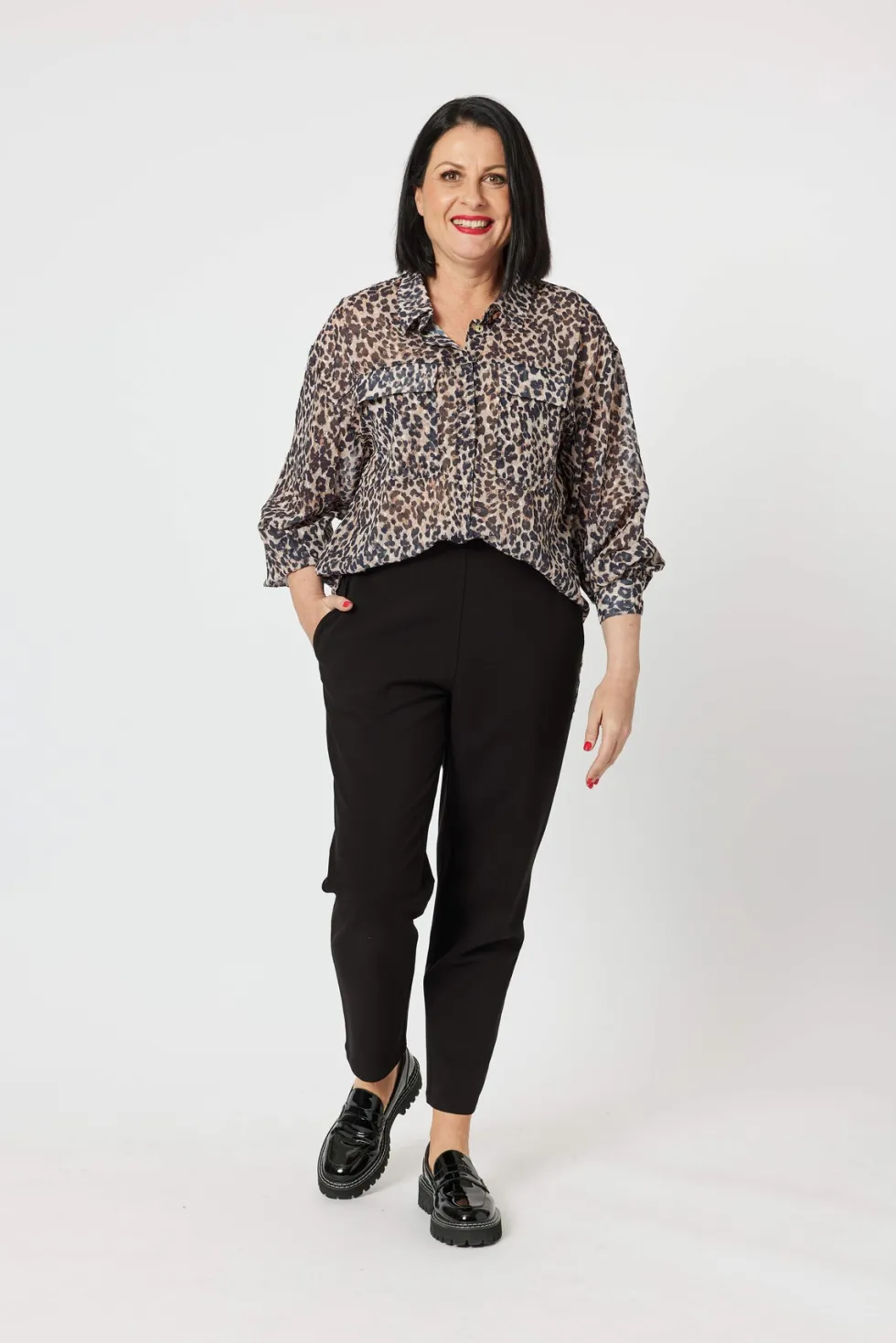44538 – Savanna Print Shirt – Animal by Hammock & Vine at The WardrobeFeatures: 100% Polyester – Slighty Sheer Chic animal print Button through front opening Patch pockets with flap detail on front Cuff detail on sleeve Fit Guide: Relaxed fit Collared Straight hem Long sleeves
