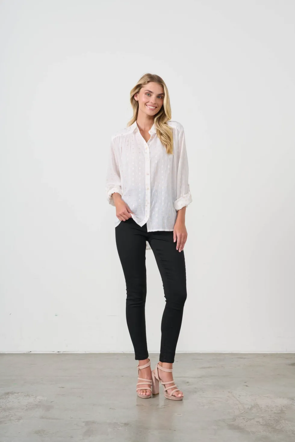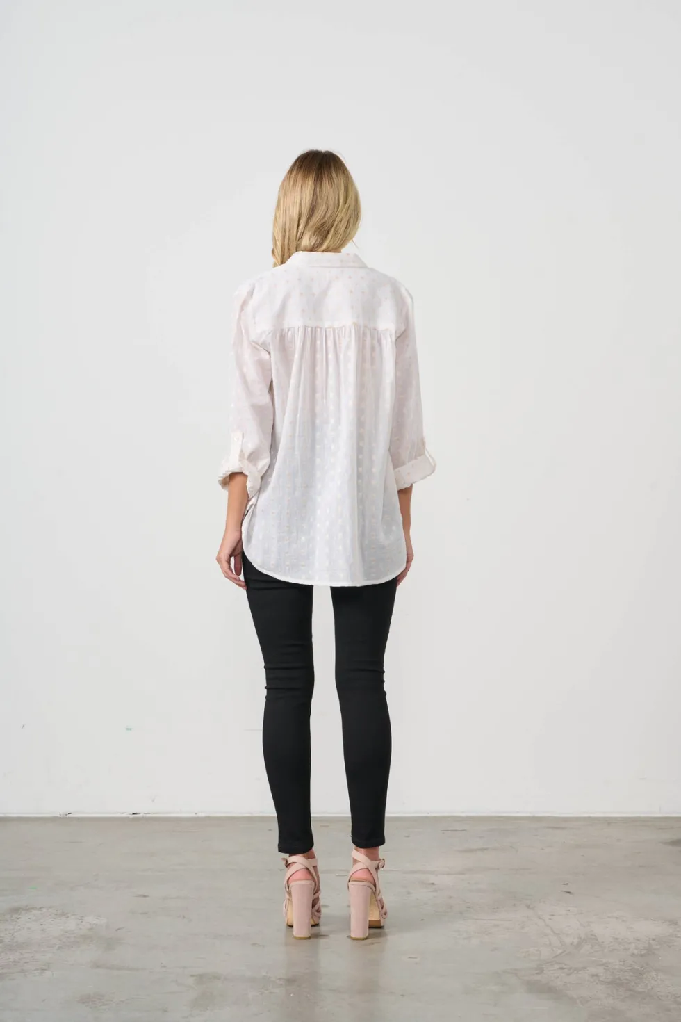 Jacquard Lurex Spot Shirt HF2661 by Holmes and Fallon at The Wardrobe. 100% Cotton Delicate lurex spots Relaxedfit Roll up sleeve with tab and button Hi-low hem Unlined This garment has no stretch Fully button through