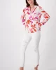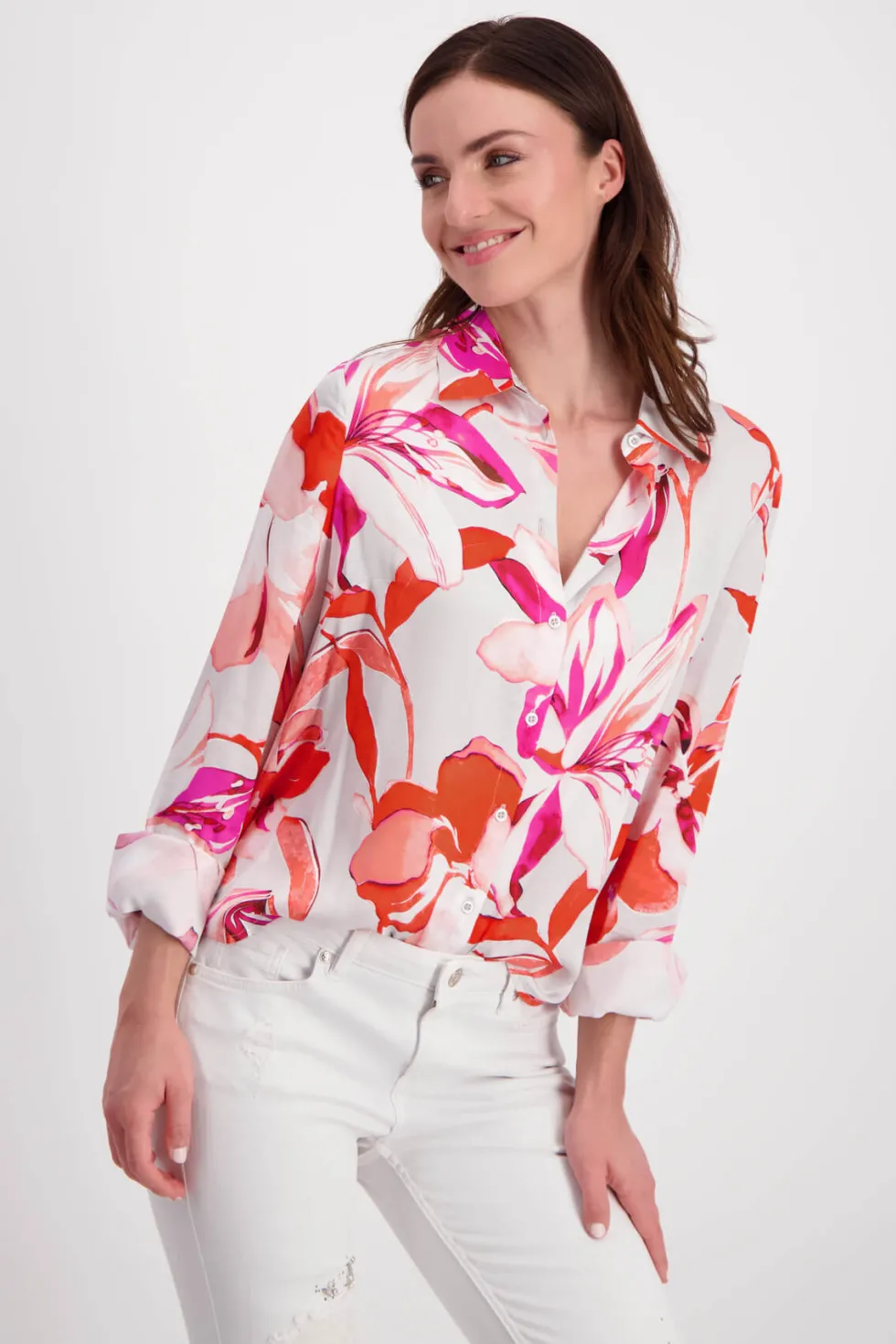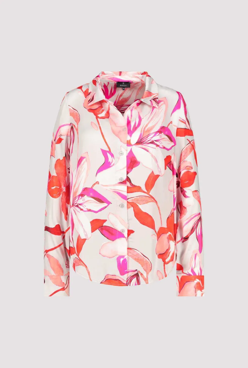 Palm Flower Print Shirt 408533 by Monari at The Wardrobe. 100% Viscose Elegant satin blouse made of light, flowing fabric. It has a floral design and a shirt collar.