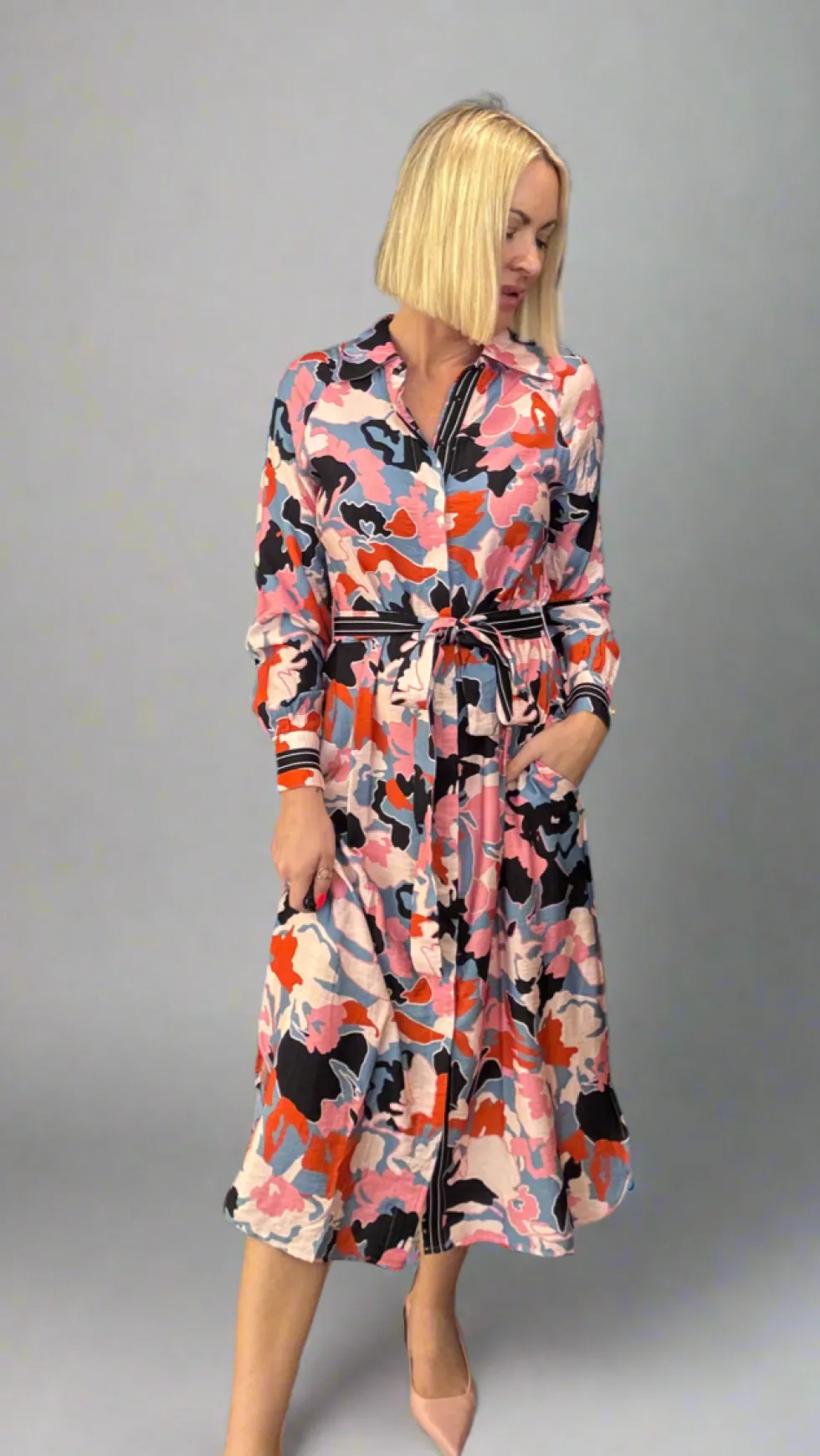 On The Shirt Dress – Neopolitan FO8105 by Foil at The Wardrobe. Belted button up maxi shirt dress with tie waist. Main: 85% Viscose, 15% NylonTape Trim: 97% Polyester, 3% Elastane Cold machine wash seperatley.