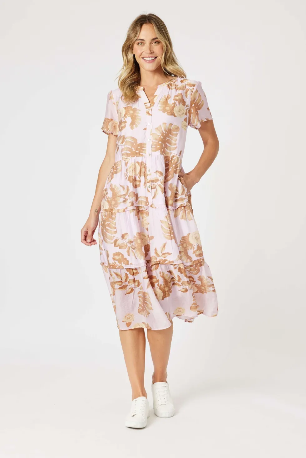 Haiti Dress – Pink/Natural 48336 by Gordon Smith at The Wardrobe The Haiti Floral Dress captures effortless femininity with its classic Gordon Smith silhouette and tropical-inspired print. Crafted from lightweight fabric, this midi dress features a soft pink base with warm-toned florals for a fresh summer look. Designe