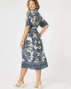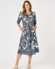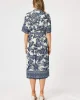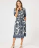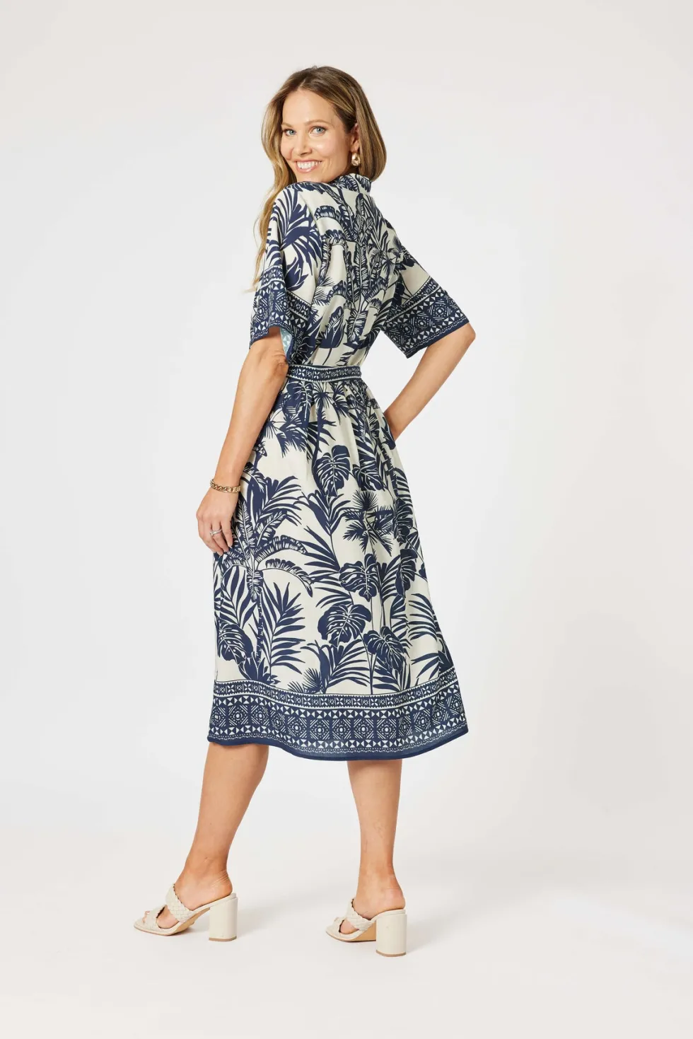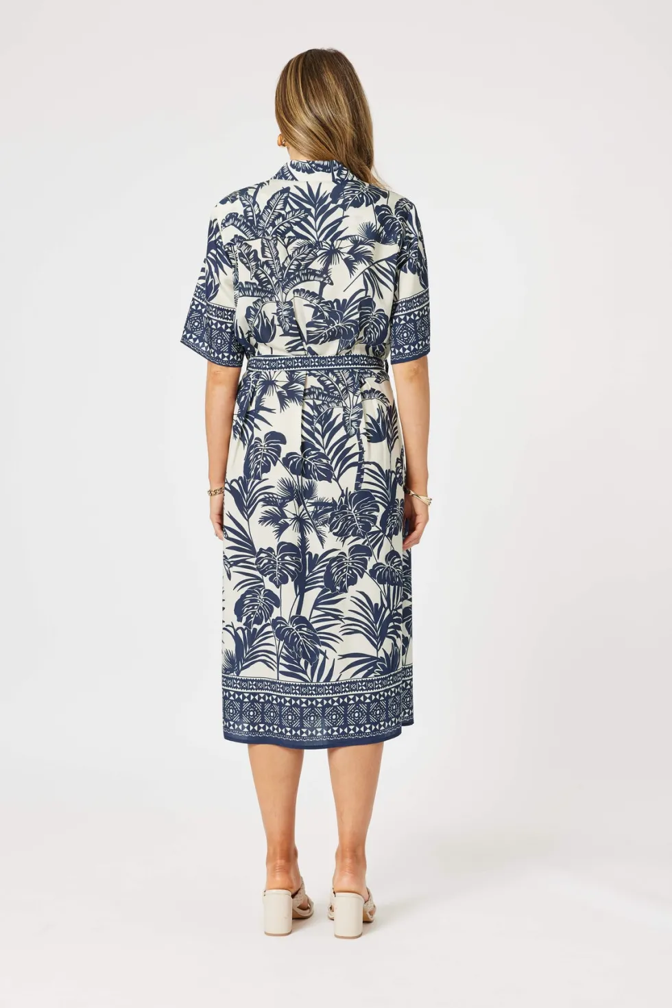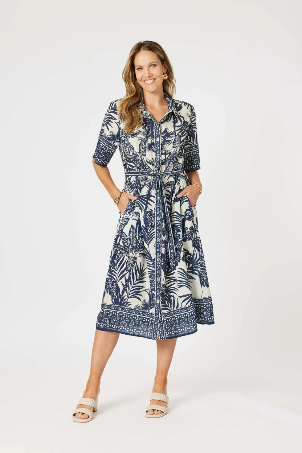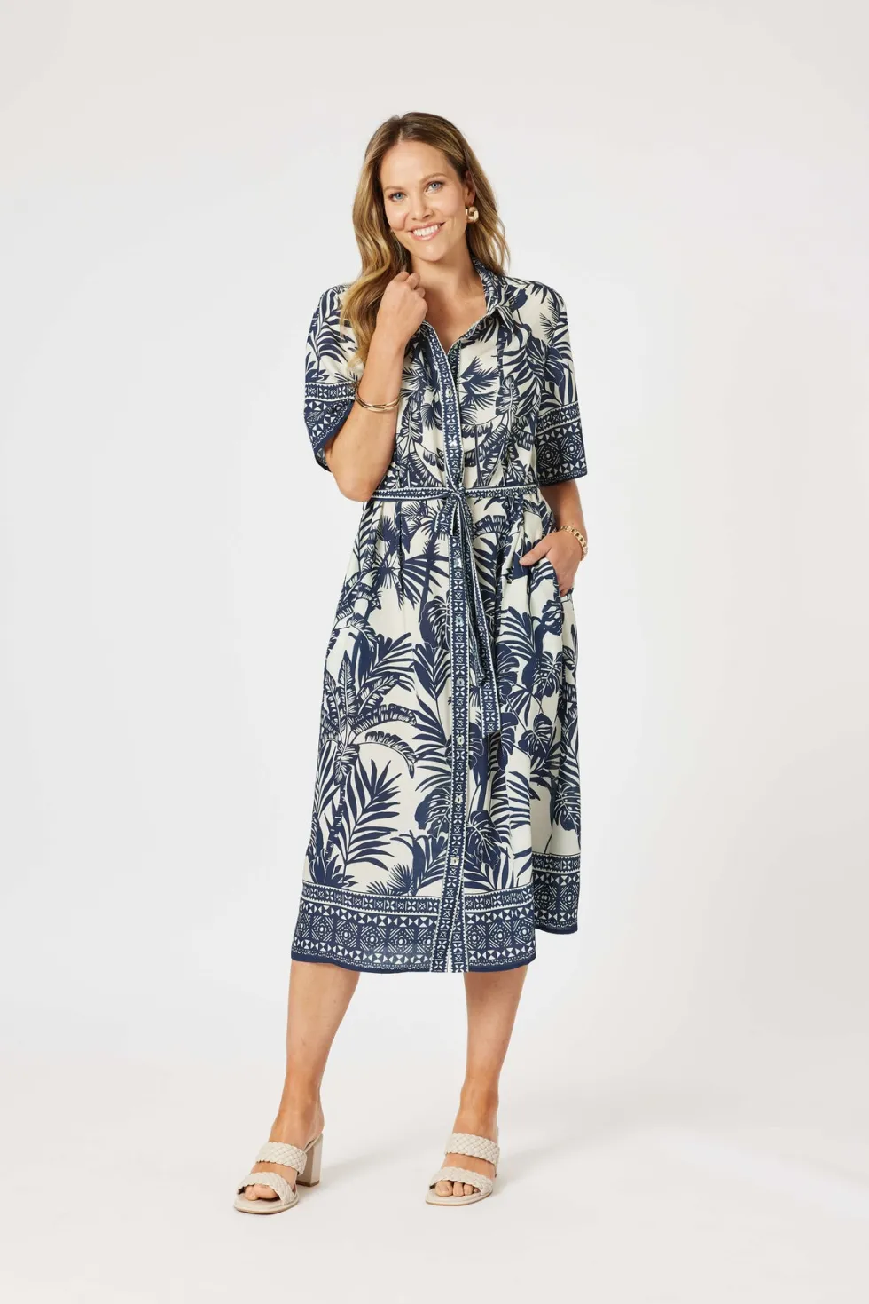 Palm Cove Dress – Navy Multi 48251 by Hammock & Vine at The Wardrobe Features: A versatile wardrobe essential, the Palm Cove Dress can be worn buttoned up for a chic, polished look or styled open as a breezy duster. Featuring a tropical palm print in a classic navy and ivory palette, this midi-length dress has shor