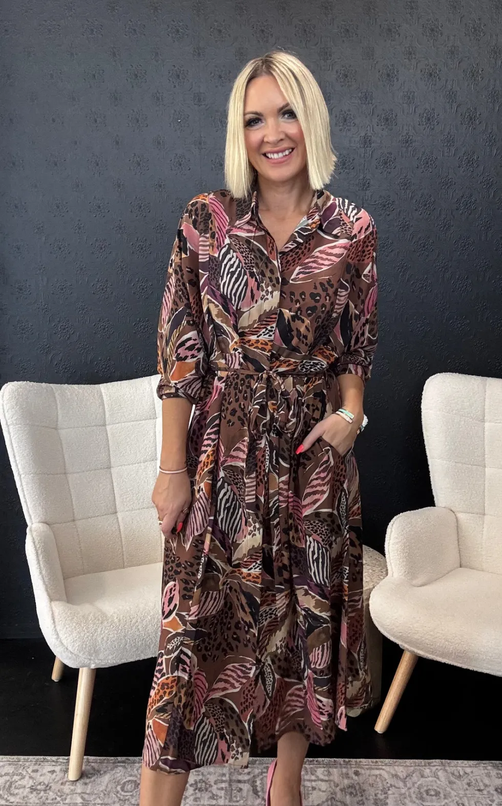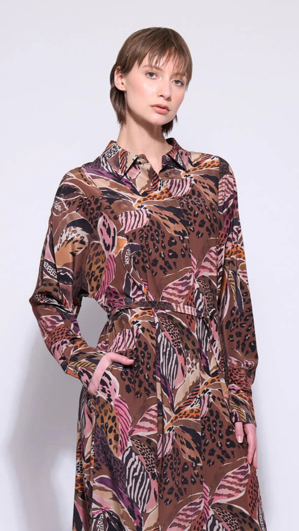 The Nala Dress 2752 by Neris at The Wardrobe, an elegant maxi-length dress designed for both comfort and style. Featuring a tie waist for a flattering fit, a classic collar, cuffed sleeves, and a concealed button-up front placket finish. Perfect for workwear or evening occasions. Designed in Christchurch, New Zealand.