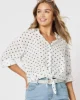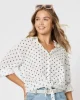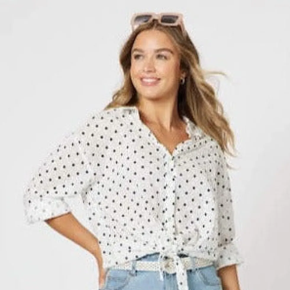 43603 – Byron Front Lace Trim Shirt Navy Features: 100% Cotton Tie front Spot design Button up Fit Guide: Long sleeve V neck Relaxed fit Hi lo fit