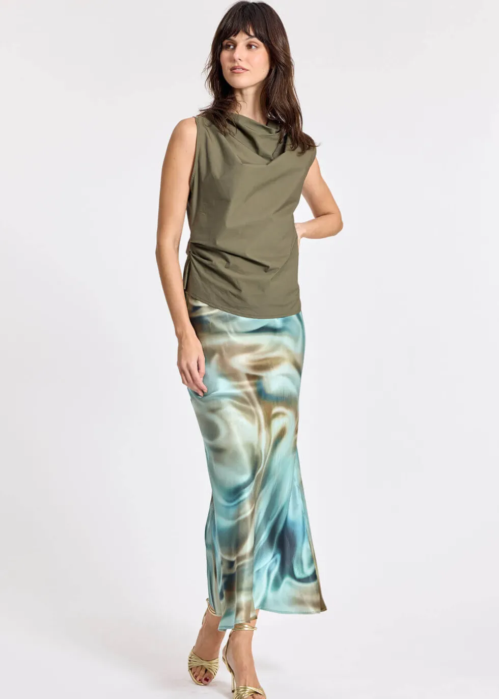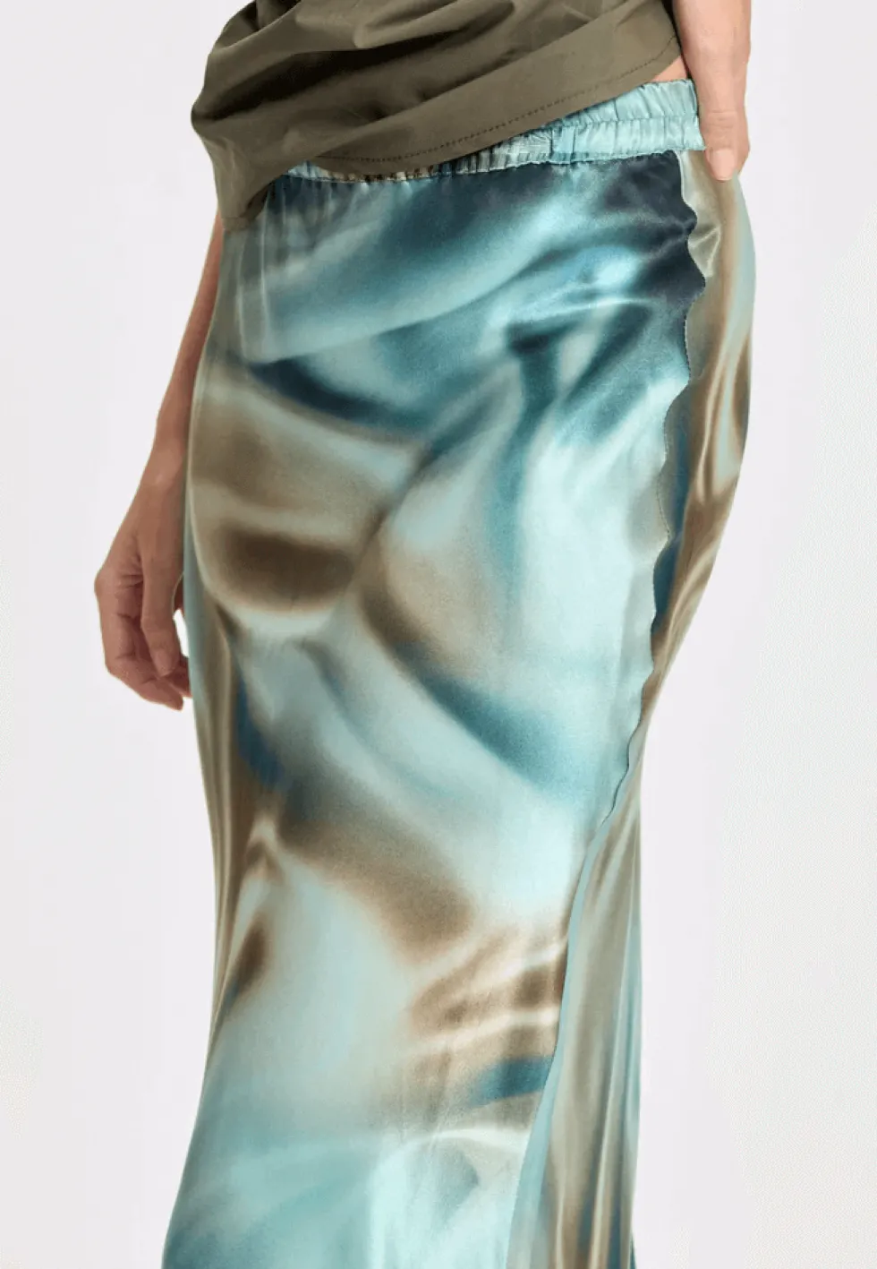 Vera Green Bias Skirt by Lauren Vidal at The Wardrobe Combining fluid elegance with summer lightness, the Vera skirt accompanies your days with ease. Its bias cut enhances movement and flatters all body shapes, in a print with soft, contrasting tones. Long bias-cut skirt for a naturally slim silhouette Fluid satin fabr