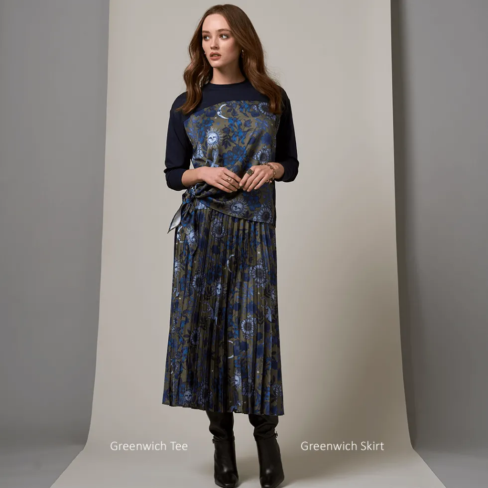 Greenwich Skirt -Olive Multi LS2915 by Loobie's Story at The Wardrobe. 100% Polyester Pleated skirt made in a lustrous soft twill, with a side entry invisible zip and back elastic waistband for a flattering fit.