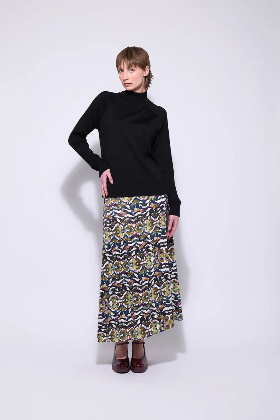 The Sloane Skirt by Neris at The Wardrobe, is a mid-length skirt made from soft viscose fabric with a luxurious silk-like finish. Its timeless design makes it easy to pair with a blouse or knitwear for a polished and versatile outfit. Designed in Christchurch, New Zealand. | 2714 100% Viscose Cold Hand Wash/Gentle Mach