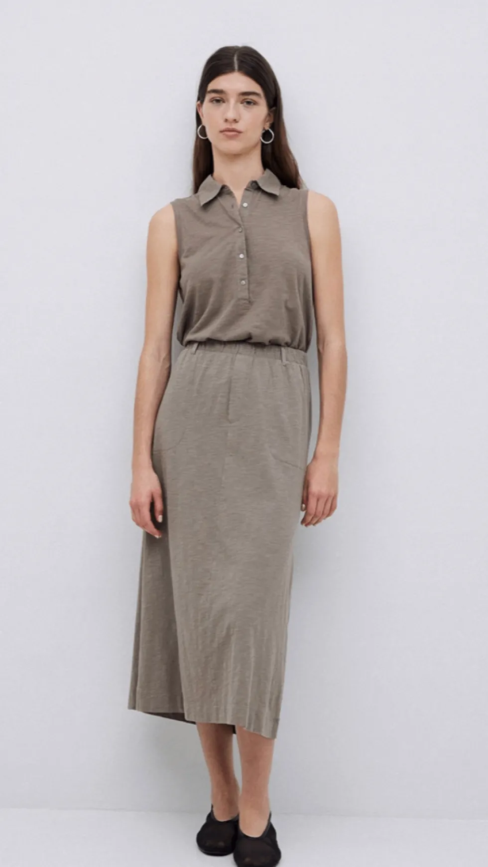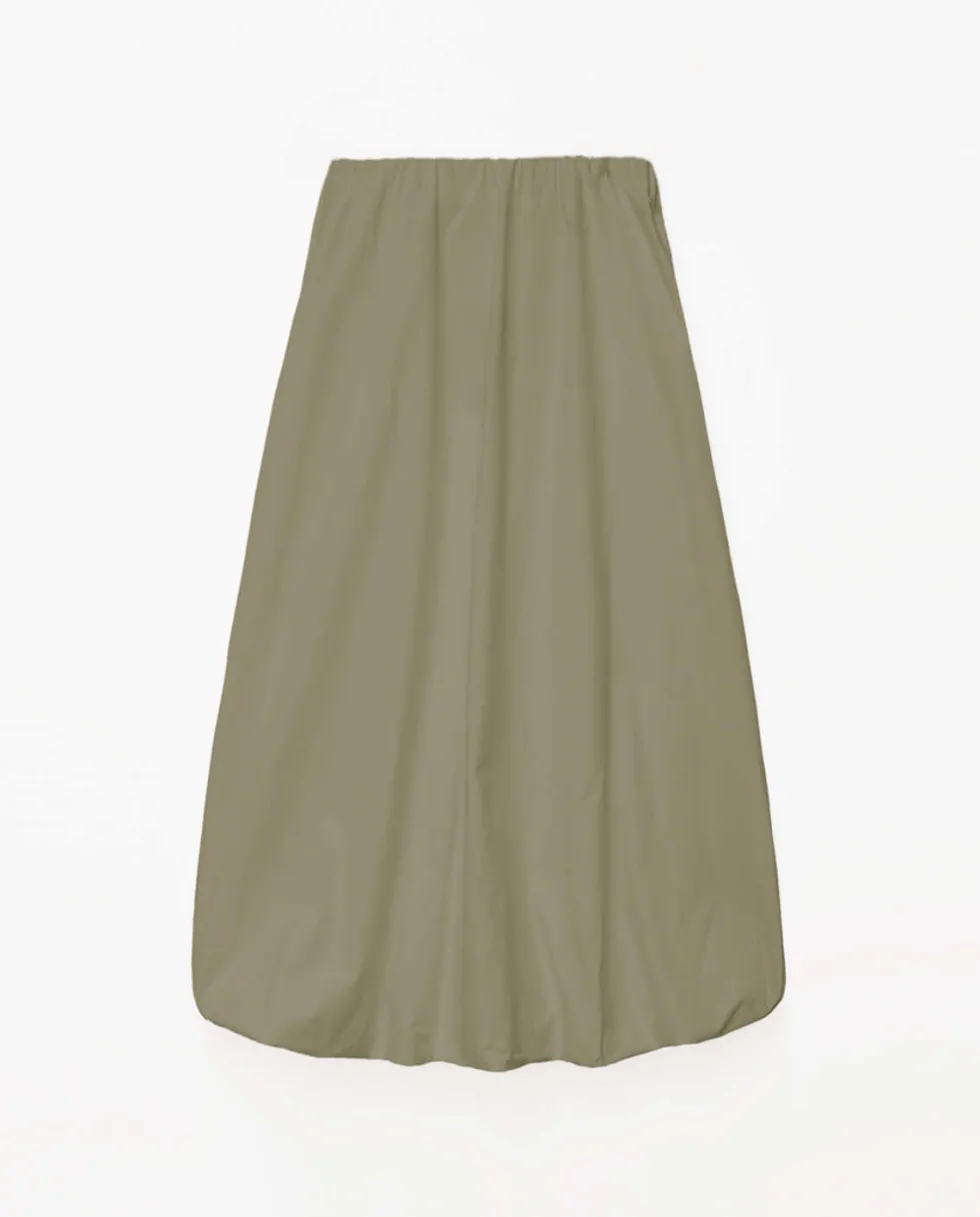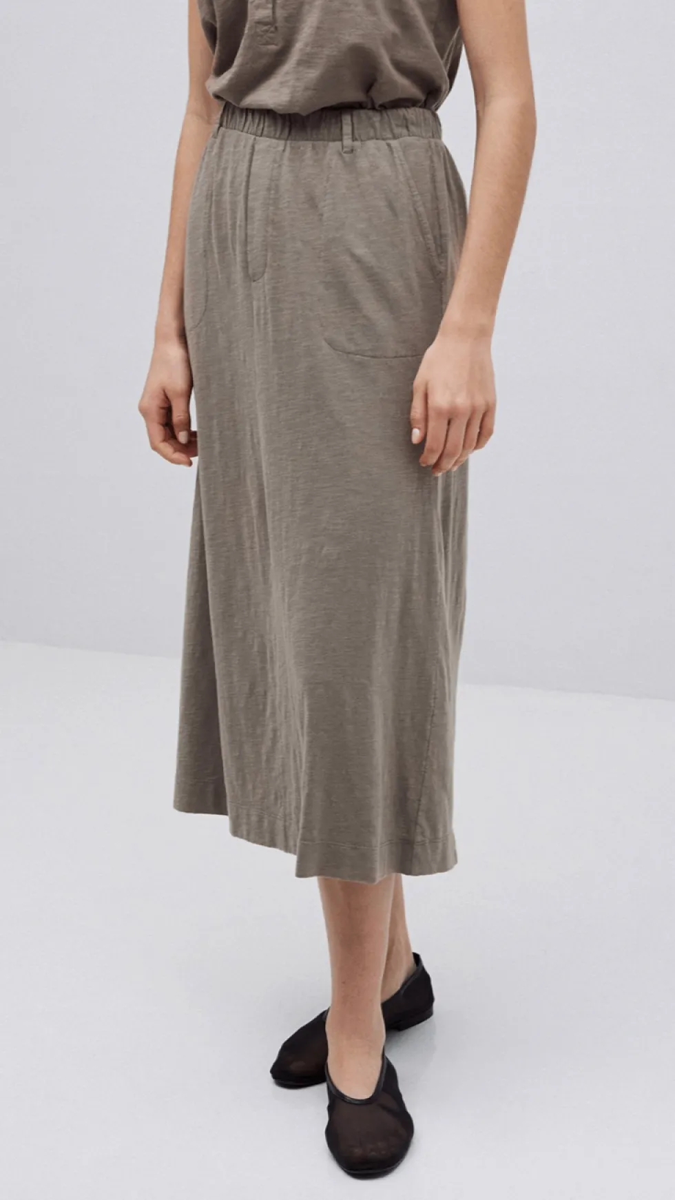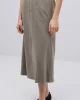 Khaki Slub Cotton Midi Skirt 42217 by Yerse at The Wardrobe. Midi skirt. Slub-cotton fabric. Mid rise. Elastic waist. Belt loops. 2 side pockets. 2 decorative buttoned pockets at the back. Model is 175 cm tall wearing size S. Composition: Fabric 1: 100% cotton Fabric 2: 60% linen, 40% cotton. MATERIALS: Cotton garments