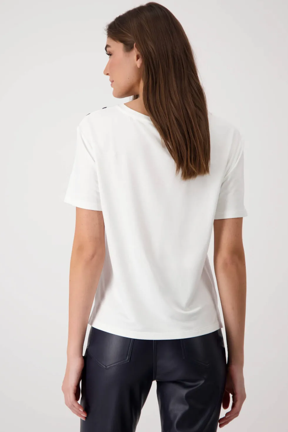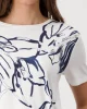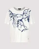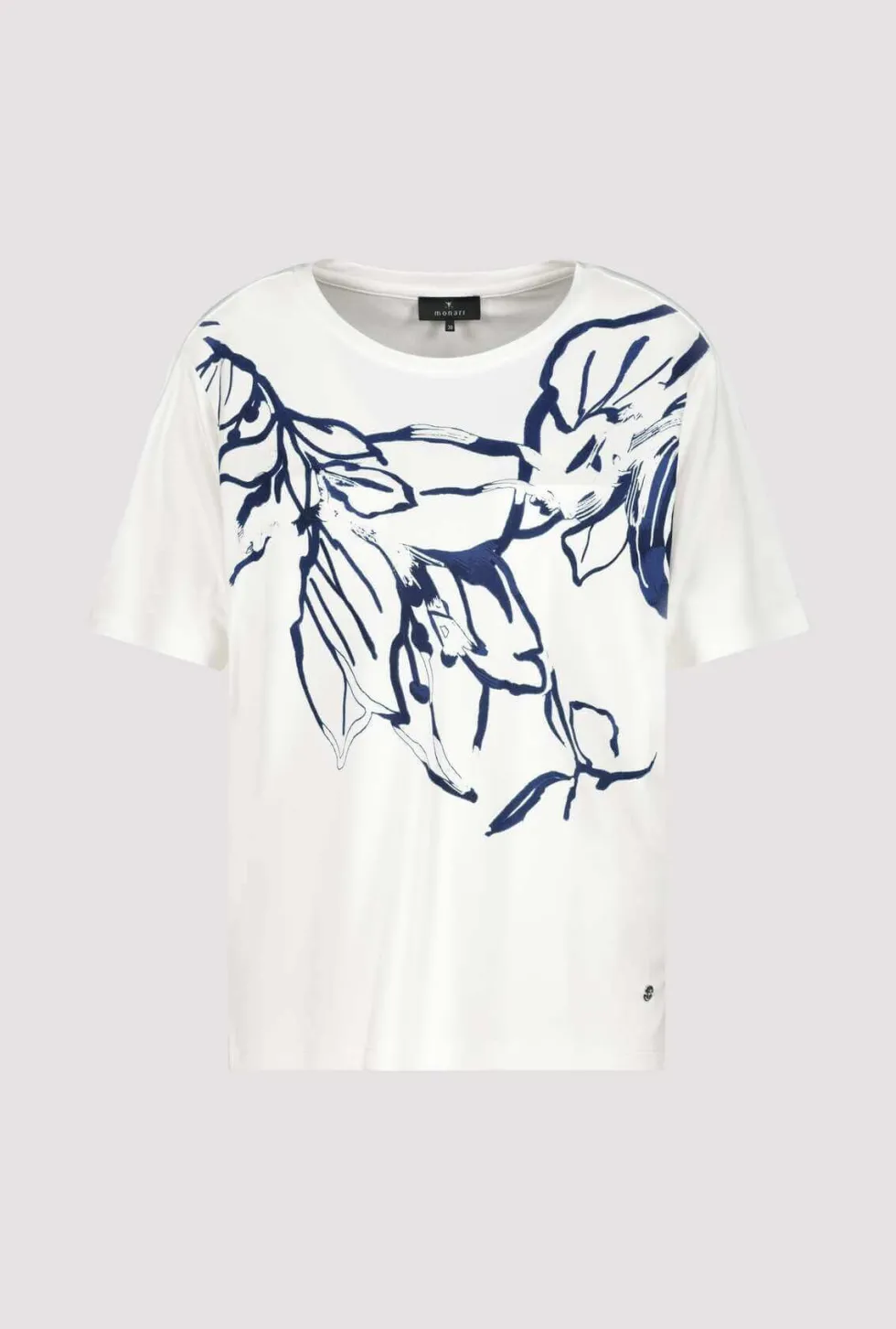Navy Floral Print T-Shirt 409092 by Monari at The Wardrobe. Flowing viscose with modal Stretchy material Floral print Rhinestones Soft feel Regular fit Round neckline Short sleeves Logo plate The model is 1.77 m tall and wears size 36. The length of size 38 is 60 cm. The floral print T-shirt is made from a flowing visc