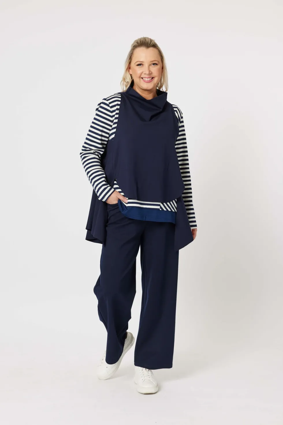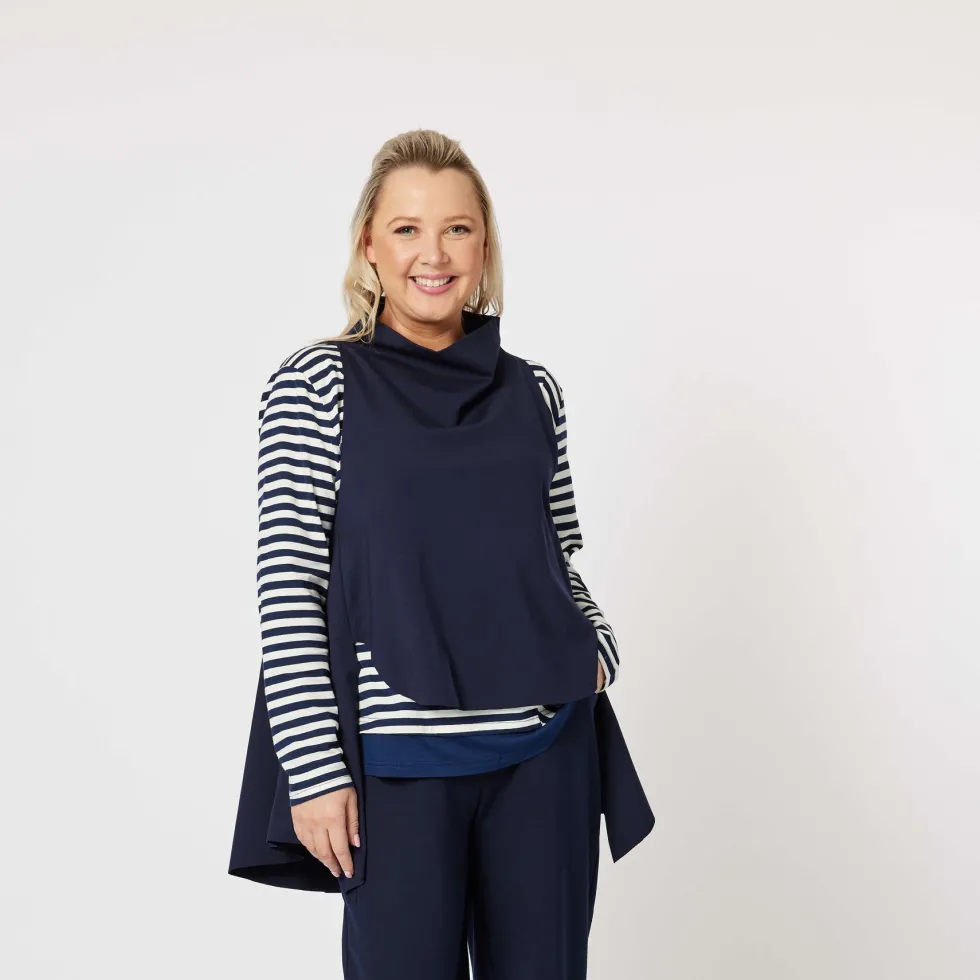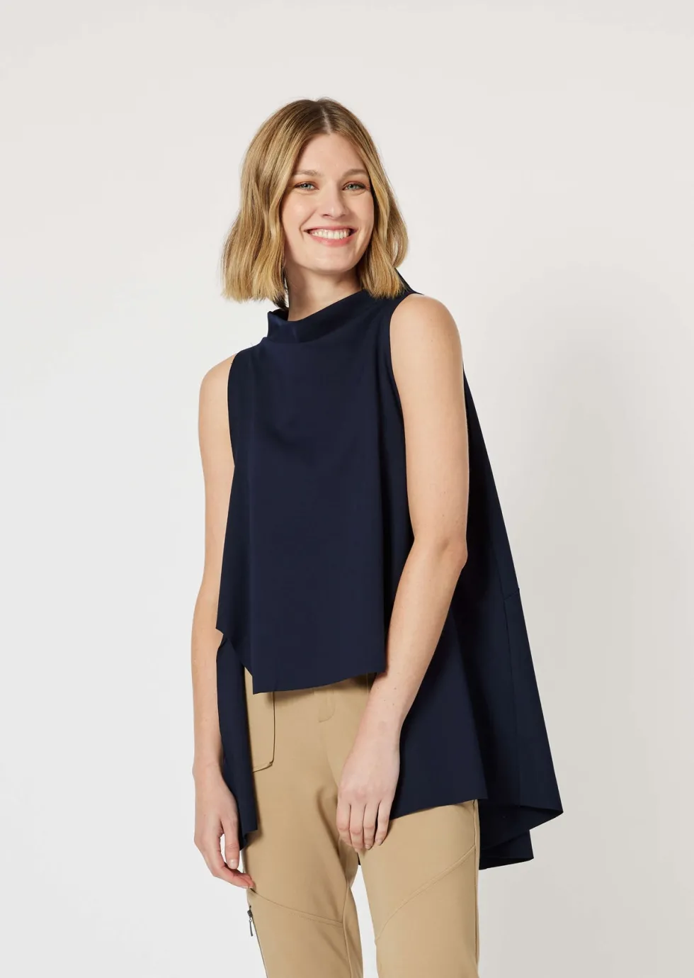 Viscose 62% Nylon 32% Elastane 6% Features: Sleeveless with drop armholes Oversized fit for ease with layering Hi-Lo hem design Fit Guide: Viscose/Nylon/Elastane Super stretch fabric High mock neck Swing back, for ease of movement & layering Generous Label – We Recommend Going Down a Size.