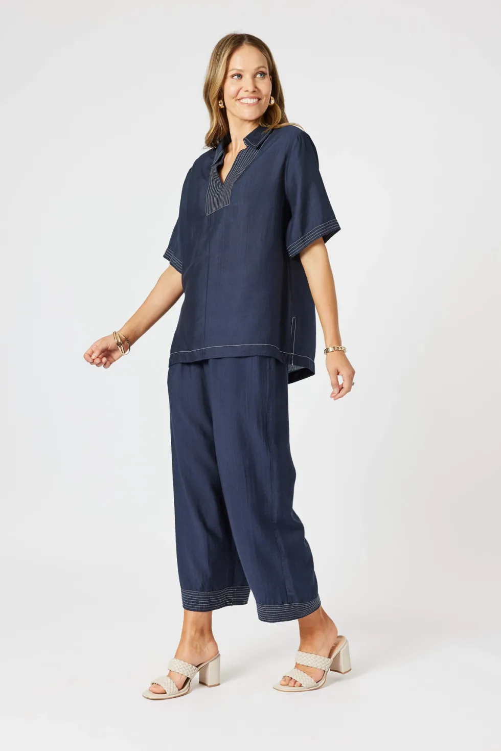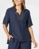 Top Stitch Detail Top – Navy 48251 by Clarity at The Wardrobe Features: Effortless style meets everyday comfort in the Top Stitch Top. Crafted from a lightweight fabric, this relaxed-fit piece features a v neck split neckline with intricate contrast topstitch detailing for a touch of artisanal charm. The short sleeves